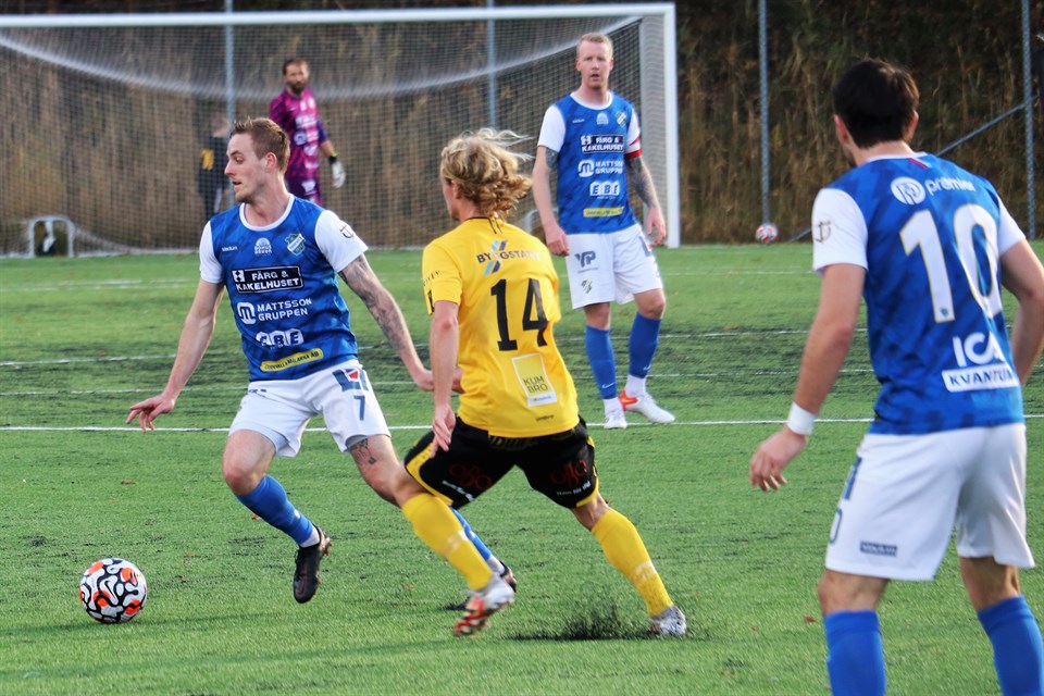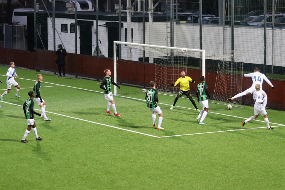 Oddevold gjorde en mycket fin insats i den andra träningsmatchen, när man på bortaplan besegrade GAIS. Matchen slutade 0-2 (0-2) och Oddevolds mål gjordes av Axel Pettersson och Gustav Kjellström. På bilden ovan ser vi hur Gustav Kjellström (nr 14) nickar in bollen framför mål till Axel Pettersson (längst till vänster), som i momentet senare gör 0-1. Foto: Susann Sannefjäll. På lördagseftermiddagen kastades Oddevold in i den värld som kommer att bli verklighet när spelet i Ettan drar i gång om knappt två månader. Att möta GAIS på bortaplan i serien blir med allra största sannolikhet det svåraste man ställs inför och i dag gjorde alltså Oddevold det, även om det denna gång var fråga om en träningsmatch. När spelet sedan började visade också GAIS under de inledande 6-7 minuterna, att det var de som ville styra och bestämma i alla skeenden. Då såg Oddevold ut som de blyga pojkarna från landet, som plötsligt kastats rakt in i lejonets kula. Mötet med sprakande och rykande pyroteknik, en röststark och segerviss hemmaklack, stor banderoll med texten ”Återtåget till Superettan” samt vetskapen om den stolta tradition som finns hos motståndarna gjorde, att man inte hittade sitt eget spel och kom rätt i sina positioner. Men efter den trevande inledningen tog man helt plötsligt över matchen under en gyllene kvart, som också blev helt avgörande för matchutgången i och med att man gjorde de två mål som tillverkades i matchen. 0-1 (15) Carl Lext blev fälld till vänster knappa 25 meter utanför värdarnas mål. Han slog den följande frisparken bortanför den bortre stolpen, där bollen nickades in framför mål av Gustav Kjellström. Framför mål kastade sig Axel Pettersson fram och styrde in bollen i det öppna målet från bara några meters håll. Knappa två minuter senare utökades ledningen. 0-2 (17) Fredrik Sundström spelade bollen till Elliot Stroud, som befann sig nära den vänstra långlinjen mitt på Oddevolds planhalva. På första tillslaget slog han en lång boll på djupet in mot mitten av planen. I kamp med två motståndare valde Gustav Kjellström, att lobba från straffområdeslinjen. Målvakten Mergim Krasniqi nådde inte bollen, utan den perfekta lobben tog vägen in i nätmaskorna. En dryg minut senare var det ytterst nära, att Oddevold utökat till 3-0 när Carl Lext blev fri från nära håll till höger om målet, men denna gång kunde en utrusande Krasniqi avstyra. Efter dryga 20 minuters spel tog GAIS över spelet igen och skapade tre riktigt bra chanser under den första halvleken, utan att få bollen i mål. Harun Ibrahim blev fri till vänster i straffområdet, men Armin Ibrahimovic gjorde en trippelräddning och Michael Kargbo sköt först en kanon i ribban och nickade senare i fritt läge från 5-6 meter, men då stod på nytt Ibrahimovic i vägen och räddade. Mot detta kunde Oddevold ställa ett friläge för Gustav Kjellström i snäv vinkel till vänster, som styrdes ut till hörna av Krasniqi. Den andra halvleken blev ganska avslagen, mycket pga många byten, sju vardera, av lagen. GAIS hade mer boll, men skapade egentligen inte en enda riktigt farlig målchans. Oddevold försvarade sig bra och styrde ut GAIS mot kanterna och skapade också ett par halvchanser, men matchens andra halva blev mållös och därmed stod Oddevold som segrare i mötet. När klockan tickat upp till 91.58 blåste domaren av matchen. En träningsmatch är alltid en träningsmatch och man ska inte dra för stora slutsatser av en sådan och särskilt inte då den äger rum så här tidigt. Det finns två månader kvar att förbättra både den enskilda spelaren och laget och laguppställningarna kan se helt annorlunda ut när allvaret börjar. Men för vår del känns det ändå bra, att vi som nykomlingar fick se, att vi hänger med bra och att vi under långa stunder kunde och vågade spela ”vårt eget spel” mot ett så kvalificerat motstånd. När det gäller individuell spelarkritik väljer jag, att plocka ut målvakten Armin Ibrahimovic, som gjorde en mycket bra insats och också fick äran att hålla nollan. Nästa träningsmatch spelas borta mot IK Gauthiod lördagen den 12 februari. Avspark sker kl 12.00 på konstgräset på Lunnevi IP. Målen 0-1 (15) Axel Pettersson (Gustav Kjellström) 0-2 (17) Gustav Kjellström (Elliot Stroud) Laget Armin Ibrahimovic Philip Engelbrektsson-Fredrik Sundström-Filip Schöön (45+1) Filip Karlin (76)-Kenan Mehovic (86)-Carl Lext (90+1)-Imer Beqiri-Elliot Stroud (90+1) Gustav Kjellström (46)-Axel Pettersson (86) Ersättare Magnus Lundberg, MV (-) Adam Bergholtz (45+1) Emil Niklasson (46) Adam Stroud (76) Jonatan Leje Bjelkholm (86) Sylejman Hoxhaj (86) Calle Ådahl (90+1) Nils Svensson (90+1) Pontus Johansson (-) Sebastian Carhed (-) Varning GAIS: - Oddevold: Kenan Mehovic (81). Domare HD: Kastriot Gerxhaliu, Skövde AD 1: Shahab Lazar, Göteborg AD 2: Roberto Incorvaia, Göteborg Publik 852