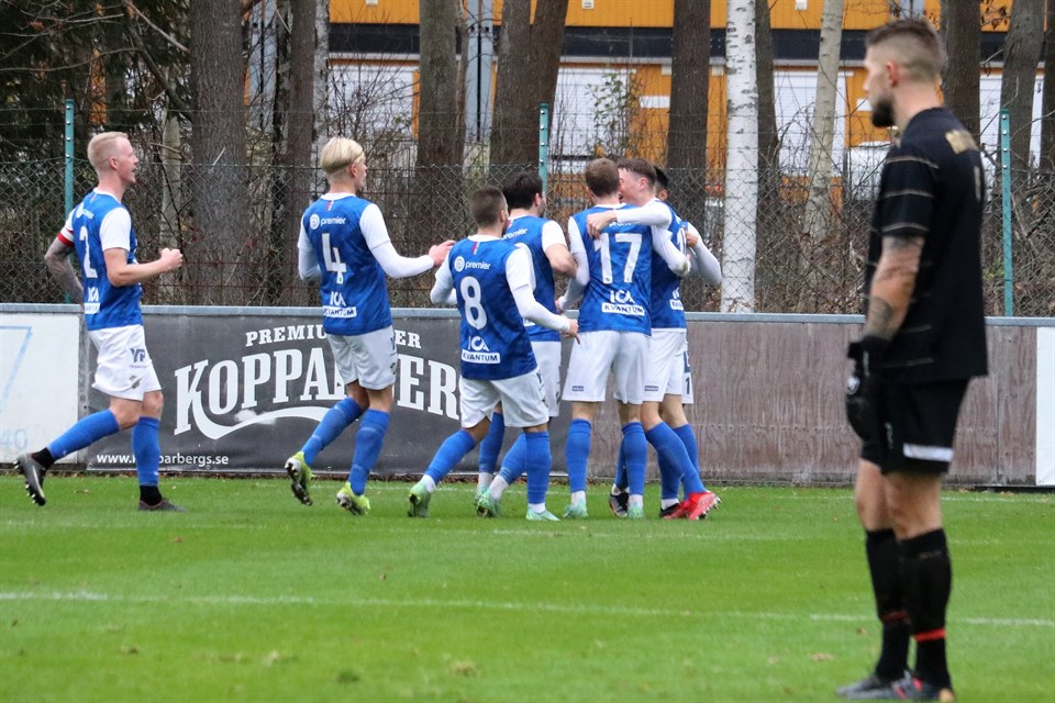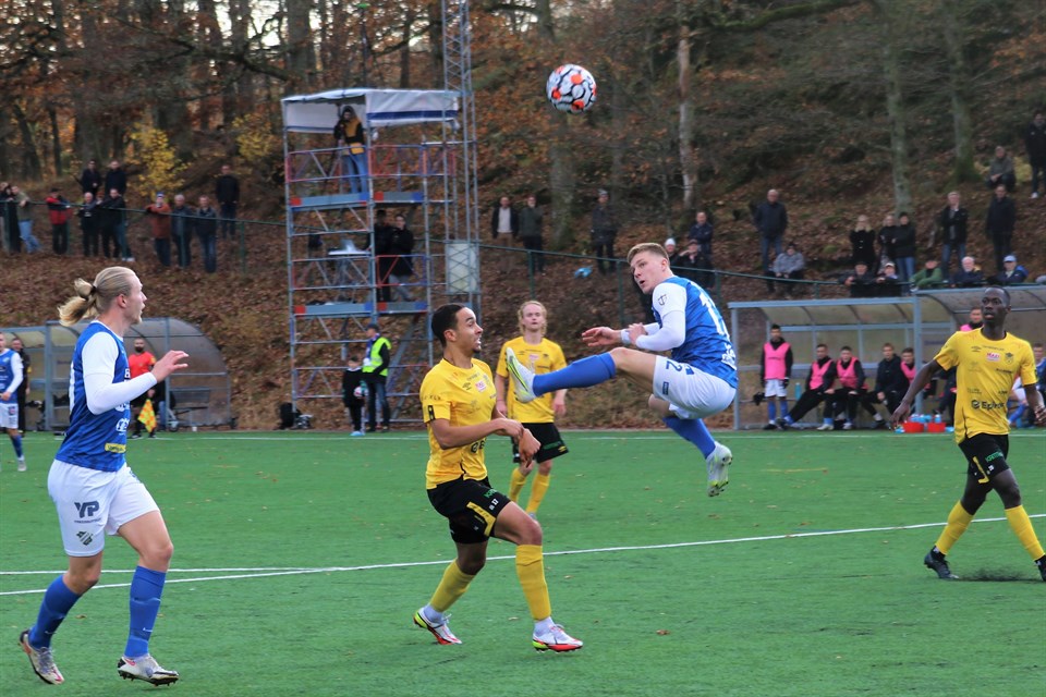 Fortsättning från ”Oddevold vann efter stopptidsdramatik – del 1” I början av andra halvlek gick Forward högre upp och störde Oddevold, som blev lite besvärade av detta, men gästerna fick överge denna taktik efter drygt tio minuter och därefter var det i stort sett bara Oddevold, både spel- och målchansmässigt. Inte vid något tillfälle behövde Besarion Kodalaev ingripa i halvleken annat än vid för långa uppspel eller bakåtspel från egna lagkamrater. På bilden ovan ser vi hur Irnnes Omicevic nickar ned bollen till Jacob Berg till det som sekunder senare utmynnade i matchens enda mål. Foto: Susann Sannefjäll. Strax innan timmen spelade Oddevold till sig en jättechans efter att Imer Beqiri slagit en crossboll ut till vänsterkanten till Emil Niklasson, som återigen tog sig förbi Mohamed Youla. Emil lyfte in bollen mot den bortre stolpen och Mido fick fritt läge från bara ett par meter, men Steffen Kraus var snabbt med på noterna och kunde rusa ut och blockera avslutet till hörna. Mido var avslutare ytterligare två gånger i mitten av halvleken, där han först nickade över efter inlägg från höger från Filip Karlin. Bästa chansen fick han i den 72:a minuten när han efter en fantastisk frispelning på första tillslaget från Imer Beqiri blev helt fri från några meter in på Forwards planhalva. Han fick Ryan Kukoyi i ryggen och var nog lite störd av det, så avslutet från strax utanför straffområdet gick ett par decimeter utanför målvaktens vänstra stolpe. Trots att tiden nu började rinna ifrån Oddevold, var det imponerande att se, hur lugnt och metodiskt man behöll det spel man hela tiden trott på och som hela året varit så framgångsrikt. Man hafsade inte i väg dåligt genomtänkta långbollar in i straffområdet, vilket hade varit svårt att nå framgång med med tanke på nickstyrkan hos innerbackarna Ryan Kukoyi och Zakariah Epplette, utan man prioriterade tålamod och värdering innan man på allvar attackerade för att försöka skapa målchanser. Båda tränarna var också nöjda med vad deras mannar presterade, vilket visade sig i att det för ovanlighetens skull dröjde ända till den 77:e minuten innan matchens första byte genomfördes. Det var Forward som gjorde detta och Oddevold väntade ytterligare sex minuter innan man växlade manskap i form av ett dubbelbyte, vilket så småningom skulle visa sig bli helt matchavgörande. Oddevold pressade nu tillbaka ett alltmer tröttkört Forward och matchen såg långa stunder ut som en handbollsmatch, där Forward försvarade sig runt straffområdet och där Oddevold spelade runt och sökte inspelsvägar förbi en djungel av försvarsben. I 80:e minuten hettade det till ordentligt två gånger om. Först efter att en frispark lyfts vidare in framför mål och där Mido skulle nicka in den från bara någon meter med målvakten bortspelad. Oddevold ropade på straff eftersom Mido fick en liten knuff i nickögonblicket, men allt man fick var en hörna, som i sin tur ledde till matchens kanske bästa målchans. I efterspelet av hörnan lyftes bollen in från höger av Filip Karlin och till slut hamnade bollen framför fötterna på Elliot Stroud. Elliot skottfintade bort två spelare med högern och lade upp bollen perfekt för avslut med godfoten, men Steffen Kraus gjorde en fantastisk räddning på det hårda skottet från 14-15 meters håll. Helt överraskande äntrade Irnnes Omicevic, som varit skadad hela året och inte spelat en minut tidigare, planen efter åttioen och en halvminut, tillsammans med Jacob Berg, och en minut senare tog han en jättelöpning i hög fart hemåt från Forwards straffområde för att stoppa Josef Ibrahim. En bit in på egen planhalva fick han stopp på Forwards skyttekung, som blev så förargad på uppvaktningen, att hans tilltag mot Irnnes i momentet efter renderade honom hans andra varning och helt plötsligt var Oddevold en spelare mer på plan. Det var så klart en fördel, även om det inte var så många minuter kvar av matchen. Det var en del tilltrasslade situationer i Forwards straffområde vid ett par tillfällen, men bollen ville inte studsa Oddevolds väg. Men så, i den sista matchminuten trodde de flesta runt arenan, att Oddevold tilldömts straff, när Mido gick omkull i straffområdet efter en närkamp med Mohamed Youla. Domaren blåste, publiken jublade, Forward fick frispark och publiken buade. Domare ansåg nämligen, att Mido överdrivit/filmat och efter ilskna protester från Oddevoldlägret och några gula kort kunde matchen återupptas. Av hoppet om seger återstod nu bara tre stopptidsminuter och många i publiken hade resignerat och vandrade modstulet mot utgångarna. Som tur var höll inte spelarna med om detta, utan lugnt och metodiskt malde de på och det som inträffade bara några sekunder senare var en belöning av allra bästa slag. 1-0 (90+2) Ett inlägg från höger in i straffområdet nickades först rakt upp i luften av Kenan Mehovic och sedan nickade Irnnes Omicevic ned bollen till Jacob Berg, som stod ungefär vid straffpunkten. Jacob trixade upp bollen, vände sig om och sköt, med lite oren träff och halvt liggande i luften, den i backen och sedan via Steffen Kraus´ fingrar och högra stolpe in i mål. Under de resterande minuterna försökte Forward, att lyfta upp spelet, men man kom ingen vart och tiden rann i väg och ut och när klockan stod på 95.44 var det slut. Det var en fantastiskt skön seger efter en otroligt nervpirrande sista halvtimma. Segern känns rättvisande trots att avgörandet föll så sent, då det var vi som styrde, ställde och bestämde i stort sett matchen igenom. Alla våra spelares prestationer var bra, där man höll för trycket och inte lät nerverna spela några spratt, utan man var helskärpta precis hela matchen och gav som vanligt inte motståndarlaget mer än en eller ett par chanser att göra mål. Nu har vi helt plötsligt beträtt ny mark och i stället för att 