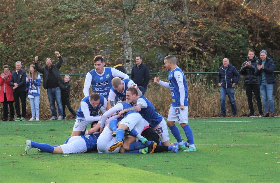 Den sedan länge emotsedda seriefinalen mot Forward fick ett oerhört dramatiskt slut, där avgörandet inte kom förrän på stopptid. Matchen slutade 1-0 (0-0) och Oddevolds mål gjordes av Jacob Berg. På bilden ovan ser vi den ofantliga glädje både spelare och publik kände efter det förlösande målet. Foto: Susann Sannefjäll. Det hade förutspåtts, att regn skulle falla denna ödesdag, där förlust för Oddevold med största sannolikhet skulle innebära, att chansen till serieseger var borta. Men det blev ingen regnig dag, varken bokstavligen eller bildligen, ty solen sken över Oddevold i båda avseenden. Men det visste så klart ingen innan bollen satts i rullning och man kände att luften var annorlunda än vanligt. Den liksom darrade av förhoppningar, förväntningar och oro. Den stora publiken, varav många hade passat på att köpa Bohus Bataljons nya och vackert blå-vita mössor och halsdukar, gav matchen en inramning vi inte upplevt de senaste två åren och när matchen väl var i gång upptäckte man ganska omgående, att detta var två topplag, som möttes i en oerhört viktig match. Den första kvarten var som den ofta är i fotbollsmatcher. Båda lagen tänkte säkerhet först och man ville känna på motståndaren, även om båda parter var på det klara med vilket slag av motståndare som stod på andra sidan. Det var som om man ville känna av hur formen var just denna dag. Det dröjde heller inte länge förrän det uppenbara kunde skönjas, nämligen att Oddevold skulle vara det bollförande laget, som med sin väl utmejslade spelidé och matchplan skulle trycka tillbaka motståndarna genom att använda varje centimeter av planens bredd. Forward å sin sida valde att acceptera detta och kröp tillbaka med ett väl samlat försvar, inkluderande två stora och nickstarka innerbackar samt en av seriens bästa målvakter, för att när tillfälle gavs, iscensätta snabba omställningar. I inledningen av matchen skapade Forward flera hörnor och två av dem kom efter räddningar från Besarion Kodalaev inom en knapp minut runt kvarten spelad. Först var det höger yttermittfältaren Johan Chamoun, som sköt ur en något snäv vinkel till höger i straffområdet och sedan var det lagkaptenen Jesper Åman, prövade skottlyckan från mitt framför målet från någon meter utanför straffområdet. Båda bollar skall en så bra målvakt som Besarion Kodalaev ta och det gjorde han också, men det gav också ett smakprov på hur farliga Forward kan vara när man snabbt ställer om. När vi hunnit ca 20 minuter in i matchen började Oddevold ta över kommandet i matchen alltmer och i den 23:e minuten skapade man första möjligheten till vad som kan kallas antydan till målchans. Emil Niklassons avslut vid bortre stolpen i bra läge gick tyvärr över ribban efter långt inlägg från vänster från Oscar Iglicar. En riktigt bra målchans spelade man emellertid till sig i den 29:e minuten, när Emil Niklasson överstegsfintade sig förbi Mohamed Youla på vänsterkanten och sedan spelade in bollen till Elliot Stroud vid den främre stolpen. Elliot fick en dålig vinkel för avslutet, men skottet från nära håll var hårt och målvakten Steffen Kraus reflexräddade med vänsterhanden. I detta skede av matchen var det inte ofta Oddevold tillät Forward, att iscensätta något eget spel som ledde till att de tog sig in på Oddevolds planhalva och bara ett par minuter efter den förra chansen var det dags för en ny bra chans efter ett inlägg från högerkanten. Oscar Iglicar slog ett väl avvägt inlägg, där Imer Beqiri hann före innerbacken Ryan Kukoyi, men nicken från 5-6 meter gick strax över. Första halvlekens bästa chans till matchens första mål fick Forward i den 39:e minuten, när man stack upp i ett av sina sällsynta anfall. Efter ett inspel från vänsterkanten från Josef Ibrahim blev Jesper Åman helt fri lite till vänster 5-6 meter in i straffområdet, men på skottet gjorde Besarion Kodalaev en jätteräddning när han slängde upp högerhanden och styrde undan bollen. Oddevold fick halvlekens sista chans fem minuter innan halvtid, när Mido släppte bollen bakåt till Oscar Iglicar, som befann sig på ungefär samma plats som Jesper Åman en minut tidigare, fast till höger i straffområdet. Skottet gick dock över. Första halvleken slutade mållös, där Oddevold hade ett klart spelövertag och skapade några fler farliga chanser än Forward, som nog ändå hade bästa chansen när Jesper Åman fick fritt fram för skott från nära håll. Fortsättning följer under ”Oddevold vann efter stopptidsdramatik – del 2”.