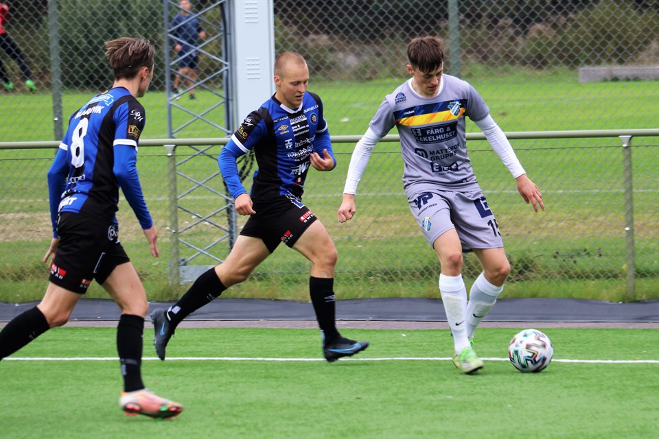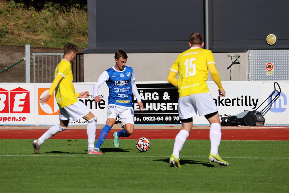 Fortsättning från ”Ny derbyseger – del 1.” När spelet i den andra halvleken började, märkte man direkt, att Oddevold var mer intresserat av att få minuterna att gå än att förbättra målskörden, medan Grebbestad ingjutits mod och hade en större vilja att gå på offensiven. När Oddevold dessutom slarvade en del i sitt passningsspel gav det möjligheter för Grebbestad att flytta upp spelet, men till målchanser hade man svårt att ta sig. På bilden ovan ser vi Mido på väg att gå i backen framför klubbkamraterna Kenan Mehovic (till vänster) och Pontus Johansson (till höger). Foto: Susann Sannefjäll. Det var över huvud taget ont om målchanser i den andra halvleken och det gick ända till den 69:e minuten innan Oddevold skapade den första och även andra efter en dubbelhörna. Båda kom från höger och slogs med innerskruv och precision av Pontus Johansson. På den första fick Mido fritt skottfält vid straffpunkten, men Mattias Jansson räddade till en ny hörna. På denna gjorde Jansson en fantastisk reflexräddning på Kenan Mehovic´ nick från bara ett par meters håll. I anfallet efter spelade Grebbestad till sig sin egentligen enda farliga målchans i hela matchen, när Valon Gashi spelade fram bollen till Isac Ohlsson, som tog den med sig och sköt från straffområdeslinjen i ganska fritt läge. Bollträffen blev dock alldeles för dålig, så Besarion Kodalaev kunde med lätthet plocka upp bollen. Målnollan skulle trots det spräckas inte långt därefter. Ett långt uppspel från Grebbestad i den 72:a minuten fångades i andraläget upp av Lukas Bäckström, som sköt från någon meter utanför straffområdet, vars skott täcktes undan av Pontus Johansson på två meters håll. Men bollen tog på armen, så domaren blåste straff. 3-1 (73) Valon Gashi slog bollen efter backen åt vänster i målet och Besarion Kodalaev gick åt rätt håll och fick fingrarna på bollen, men kunde ändå inte förhindra den från att gå i mål. Oddevold tog därefter återigen helt hand om spelet och med stort bollinnehav tillät man inte Grebbestad, att oroa speciellt mycket. I stället skapade man själva ett flertal bra omställningslägen, där man några gånger var fler spelare än Grebbestads försvarare, men oskärpa och felbeslut gjorde att man inte gjorde fler mål. I 80:e minuten såg det först ut som man gjort ett fjärde mål på nick genom Kenan Mehovic, efter en ny välslagen högerhörna av Pontus Johansson, men domaren blåste för ruff av en annan Oddevoldspelare på målvakten i momentet innan. Under resterande tio minuter plus stopptid hände inte så mycket och när klockan nått till 93.39 blåste domaren av matchen. Det var en mycket väl genomförd match av Oddevold och starkt att vinna för nionde matchen i rad, där alla varit sk måste-matcher. Jag väljer orden noggrannhet, fokus och samarbete, som orsak till att segersviten förlängdes. Nu väntar en fantastiskt intressant match i nästa omgång, när vår enda konkurrent om seriesegern, BK Forward, kommer på besök i en sedan länge emotsedd seriefinal. Målen 1-0 (0.41) Oscar Iglicar 2-0 (22.23) Elliot Stroud 3-0 (36.27) Niclas Holgersson 3-1 (72.16) Valon Gashi (straff) Laget Besarion Kodalaev Philip Engelbrektsson-Fredrik Sundström-Pontus Johansson Filip Karlin (59)-Imer Beqiri-Niclas Holgersson-Kenan Mehovic-Filip Schöön (59) Elliot Stroud (59)-Oscar Iglicar (59) Ersättare Armin Ibrahimovic, MV (-) Mido (59) Armend Shillova (59) Jacob Berg (59) Bilal Moussa (59) Philip Nilsson Sparf (88) Jonatan Leje Bjelkholm (-) Utvisning Grebbestad: Christoffer Söderlund L (90+1, 90+3). Varningar Oddevold: Pontus Johansson (72). Grebbestad: Isac Ohlsson (8), Oscar Landgren (33). Domare HD: Ahmed Abid, Örebro AD 1: Ziya Kahramanoglu, Örebro AD 2: Carlos Kaly, Örebro Publik 443