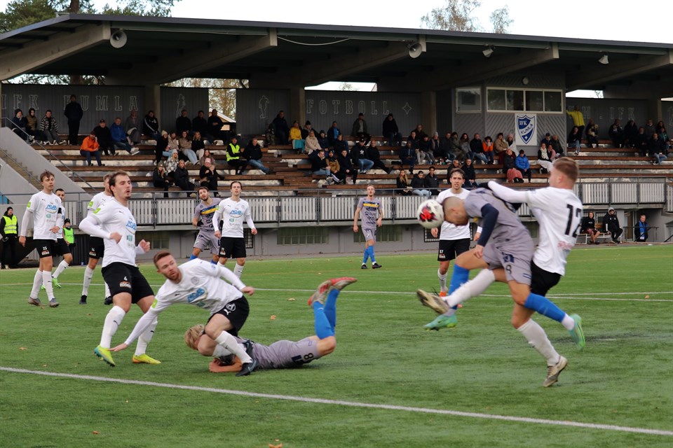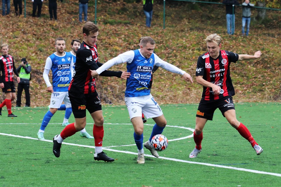 I den svåra bortamatchen mot Yxhult tog Oddevold tre mycket värdefulla poäng i en match där man var det något bättre laget. Matchen slutade 0-2 (0-1) och båda Oddevolds mål gjordes av Oscar Iglicar. På bilden ovan ser vi Oscar Iglicar pressa sig förbi Elias Jangdin och nicka in sitt andra mål för dagen. Foto: Susann Sannefjäll. I förra bortamatchen mötte vi IFK Kumla på Kumla IP och i dag var vi tillbaka på samma arena i mötet med Yxhults IK. Matchen skulle egentligen gått på Moabvallen, Yxhults ordinarie hemmaplan, men höstens många millimeter väta tvingade hemmalaget att byta från natur- till konstgräs. Dock svajade IFK Kumlas flagga majestätiskt i vinden hela tiden bakom Oddevolds avbytarbås. Oddevold formligen flög ur startblocken som en hundrameterslöpare och satte en enorm press mot Yxhults mål. Under första kvarten var bollen i stort sett bara över på Oddevolds planhalva vid ett tillfälle och man skapade ett halvdussin chanser av måldoftande karaktär. Redan efter dryga tre minuter spelade Armend Shillova fram Imer Beqiri till fritt skottläge från straffområdeslinjen, men avslutet blev både för löst och rakt på målvakten Alex Berger. Två minuter senare fick Yxhult till en bra omställning när Munir Omar Farazj slog en djupledsboll till Jens Grönneberg Johansen, som från 20 meter träffade utsidan på Besarion Kodalaevs högra stolpe. Kodalaev följde med bollen utan att slänga sig och hade förmodligen styrt undan den om han hade behövt. I femminutersperioden efter spelade tio minuter hettade det till ordentligt i hemmalagets straffområde. Först blev Emil Niklasson fälld, men en bra placerad domare vinkade omedelbart friande, sedan fick både Emil Niklasson och Niclas Holgersson bra men resultatlösa skottlägen, där Holgerssons var en riktigt het chans, samt strax därefter ett friläge för Armend Shillova, vars skott stoppades förtjänstfullt med en enhandsräddning av Berger i hemmamålet. Det fortsatte med att Emil Niklasson tog ned ett inlägg på bröstet från högerkanten från Imer Beqiri, varvid han drog till på volley från 16 meter, men en oren träff förstörde den fina chansen. Sedan fick Oddevold lite svårare att behålla det fina spelet och med det försvann också målchanserna under en dryg kvart. I den 34:e minuten stötte Niclas Holgersson bollen i djupled mellan Yxhults försvarare, som friställde djupledslöpande Armend Shillova, men avslutet med vänstern fick dålig fart, så Berger kunde rädda på nytt. Efter det blev det återigen stiltje på måltillfällen och matchen tycktes gå till pausvila utan mål, men Oddevold ville annat och kunde med lite mer än två minuter kvar spräcka målnollan. 0-1 (43) Niclas Holgersson svarade för ett fantastiskt fint förarbete till matchens första mål. Först erövrade han bollen mitt på Yxhult planhalva nära den vänstra långlinjen. Därefter tog han sig förbi två motståndare, för att sedan slå ett inlägg strax innan kortlinjen. Bollen nickades vid målområdeslinjen vid den främre stolpen rakt upp i luften av tidigt inbytte Diar Hasani varpå Oscar Iglicar, när bollen kom ner, nickade den i mål nära målvakten Alex Bergers vänstra stolpe. Oddevold var det bättre laget även i den andra halvleken, men trots ett spelövertag skapades bara ett fåtal chanser. En bidragande orsak till detta var så klart, att man hade sin ledning att gå på. Å andra sidan tillät man inte Yxhult att skapa någon farlighet mer än vid en hörna i mitten av halvleken, som inte utmynnade i en farlighet, men där Oddevold hade lite svårt att få undan bollen. Annars var det nära att Oddevold utökat sin ledning i den 56:e minuten på en högerhörna från Emil Holgersson. Imer Beqiri fick stå helt omarkerad vid den bortre stolpen och kunde i lugn och ro ställa in siktet, men nicken gick några decimeter utanför Alex Bergers vänstra stolpe. Filip Karlin snurrade och vände bort sin motståndare i den 62:a minuten strax utanför målområdet och fick fritt skottfält, men dålig bollträff gjorde att skottet inte ställde till problem för Yxhultsmålvakten. Oddevold spelade lugnt och säkert i sitt sökande efter ett andra mål och lät för det mesta Yxhult jaga boll, tills det rätta tillfället att slå till dök upp med dryga tio minuter av ordinarie speltid kvar. 0-2 (79) Kenan Mehovic bröt ett uppspel från Yxhult, som var på väg att starta en omställning, och spelade sen bollen till Imer Beqiri, som var placerad på straffområdeslinjen till höger. Vid den bortre stolpen löpte Oscar Iglicar mot mål och lyftningen från Imer passade Oscars löpning perfekt, när han satte huvudet till och nickade bollen via backen i mål nära Alex Bergers högra stolpe. Yxhult, som efter 0-1 tappade lite entusiasm, tappade efter detta mål även hoppet och Oddevold fick en behaglig och bekväm resa mot matchens sista signal. Det enda värt att notera som hände under den sista kvarten var när Filip Karlin bjöd på ett shownummer någon minut efter 0-2, då han med bollen mellan båda fötterna lyfte den bakom ryggen, över sitt eget huvud och förbi en motståndare. Mål blev det inte, men han bjöds på ett beundrande ”Ooohhh” från såväl hemma- som bortasupportrar. Klockan nådde upp till 93.12 när domaren blåste av tillställningen. Detta var ytterligare en i raden av stabila insatser av Oddevold. I den pressade situationen att inte tappa mark gentemot Forward lyckades man hålla huvudet kallt och nerverna under kontroll och ta en nödvändig seger. Grunden var som vanligt en bra organisation, bolltrygghet och ett bra försvarsspel, där hela laget hjälpte varandra och arbetade intensivt och disciplinerat i strävan att förhindra motståndarna från att skapa målchanser. Detta var en bra laginsats från alla fötter och huvuden, där Oscar Iglicar måste belönas med en extra stjärna. Hans två mål blev ju avgörande och vid inget av dem var