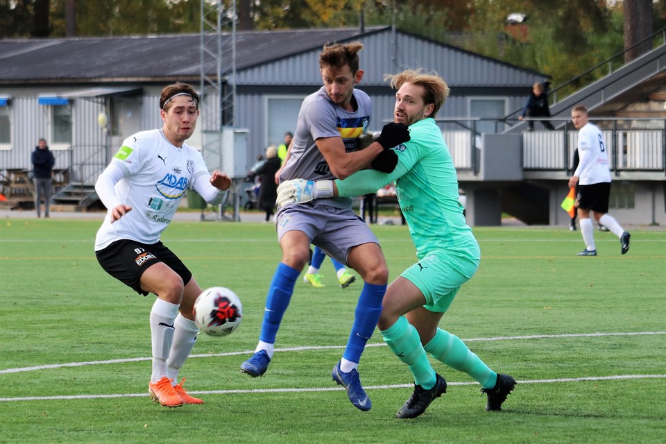 Oddevold var det klart bättre laget i bohusderbyt mot Grebbestad och hade i stort sett redan avgjort matchen i första halvlek. Matchen slutade 3-1 (3-0) och Oddevolds mål gjordes av Oscar Iglicar, Elliot Stroud och Niclas Holgersson. På bilden ovan ser vi Filip Schöön i kamp med två Grebbestadsspelare med Oddevoldarna Oscar Iglicar (främst) och Imer Beqiri (längst bak) i bakgrunden. Foto: Susann Sannefjäll. För andra hemmamatchen i rad spelades den på Thordéngården och liksom förra gången gällde det att ha intagit sin plats i tid, för att inte missa Oddevolds ledningsmål. Det gällde i ännu högre grad vid denna match, då Oscar Iglicar beslutat sig för att mer än halvera tidsåtgången från senast mot Stenungsunds IF. Då tog det 93 sekunder, i dag räckte det med 41. 1-0 (1) Ett Grebbestadsuppspel på dess högerkant stoppades av Pontus Johansson, som nickade ned bollen till Kenan Mehovic. Kenan befann sig nära den vänstra långlinjen tiotalet meter in på egenplanhalva, vände sig om och slog en rak boll till djupledslöpande Oscar Iglicar. Löpningen ställde Oscar i friläge med den utrusande målvakten Mattias Jansson och från straffområdeslinjen lobbade han mycket elegant bollen i mål i den bortre burgaveln. En härlig start att få och särskilt om man kan fortsätta att vara koncentrerad och inte falla i fällan att slappna av och tycka att ”det här blir ju enkelt”. Det skulle visa sig, att Oddevold var fullt fokuserade i hela den första halvleken och i så hög grad, att man i stort sett avgjort matchen när man gick till pausvila. För man gav inte Grebbestad tid eller utrymme, att få i gång ett eget spel. Man pressade hårt och samlat mot bollhållaren och erövrade oftast bollen högt upp. Man skapade också ett flertal chanser, som kunde lett till ett tidigare andramål än när det kom mitt i halvleken. Efter en spelvändning i den nionde minuten kom bollen ut till Filip Schöön på vänsterkanten. På hans fina inlägg nickade Niclas Holgersson över i fritt läge från fem meter och tre minuter senare var det Filip själv som fick en bra chans till utökad ledning. Efter bra förarbete av Elliot Stroud fick Filip fritt skottfält till vänster i straffområdet, men Mattias Jansson räddade med en fotparad. Returen gick till Oscar Iglicar, som fick skapligt skottläge, men han fick ingen fart på bollen, så den räddningen blev enkel för mål-Jansson. På en högerhörna i den 16:e minuten från var det mycket folk vi den främre stolpen och Grebbestad fick inte undan bollen, utan Philip Engelbrektsson kunde klacka den mot mål, men på mållinjen stod en Grebbestadsspelare och kunde rensa undan. Oddevold tryckte på och var verkligen ute efter mer än det mål man redan gjort och bara sekunderna innan det andra föll, var det ytterst nära när Niclas Holgersson frispelade Oscar Iglicar. Tyvärr fick Oscar bollen lite för långt ifrån sig och Mattias Jansson kom snabbt ut och kom så nära bollen, att han kunde avstyra lyftningen. 2-0 (23) Elliot Stroud och Imer Beqiri bröt tillsammans det uppspel mitt på Grebbestads planhalva, som Jansson satte i gång efter den ovan nämnda chansen, och Imer spelade sedan bollen till Elliot Stroud, som tog sig förbi Peter Mandic och inåt i plan. När han kom mitt framför mål avlossade han med sin vänster från 20 meter ett skott, som en fullt utsträckt Mattias Jansson inte nådde, då bollen smet in efter backen precis intill hans vänstra stolpe. Det var härligt att se, att Oddevoldspelarna även med tvåmålsledning inte var nöjda, utan man fortsatte, att göra livet surt för Grebbestad och bara några minuter efter 2-0-målet var det nära att man fått ny utdelning, när den höga och välkoordinerade höga pressen utmynnade i ett friläge. Elliot Strouds väggpassning till Imer Beqiri gjorde att denne blev helt ren till höger i straffområdet, men han kom lite för nära Mattias Jansson, som genom ett nytt snabbt agerande räddade sitt lag från baklängesmål. Men inte ens Mattias Jansson kunde förhindra, att Oddevold kunde göra ett tredje mål innan pausvilan. 3-0 (37) Efter ett inkast lång nere på högerkanten spelade Filip Karlin bollen till Imer Beqiri, som befann sig precis utanför straffområdet längst till höger. Därifrån slog han ett perfekt inlägg, som Niclas Holgersson kastade sig fram på före Oscar Landgren och stötte in bollen från målområdeslinjen vid den bortre stolpen. När halvtidssignalen ljöd vandrade ett nöjt Oddevold in i omklädningsrummet, medan Grebbestad var tvungna att komma på ett sätt att åstadkomma en markant kvalitetsförbättring till den andra halvleken för att ha en chans till poäng. Fortsättning följer under ”Ny derbyseger – del 2”.