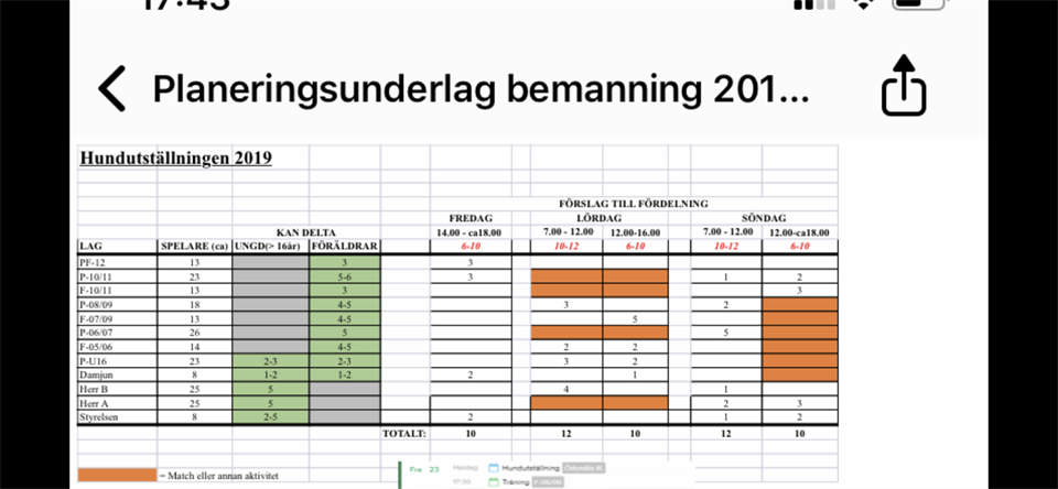 Hej! Som tidigare utskick har meddelat så har ÖIK fått chansen att få möjligheten att hjälpa till under hundutställningen på Backamo 23-25/8. Det innebär rodda och hjälpa till att bygga upp, sen under helgen ta hand hand om parkeringen m.m för att sedan hjälpa till att ta ner hoppborg m.m på söndagen. Detta genererar en stor summa pengar direkt till klubben. Varje lag har fått ett uppdrag så nu hoppas jag vi kan hjälpas åt att fixa detta och bemanna dagarna vi fått. Schemat är lagt och jag bifogar det i texten nedan. Vi har fått 3 pass: * 3 föräldrar på fredag kl.14-ca 18 * 1 förälder på sön kl.7-12 * 2 föräldrar på sön kl.12-ca18 Jag vet att det är kort varsel och att helgen är helig- men vore grymt om vi kunde fixa detta! Meddela mig gärna så snart ni kan, så vidarebefordar jag till ansvarig för bemanning. Ha en grym dag!