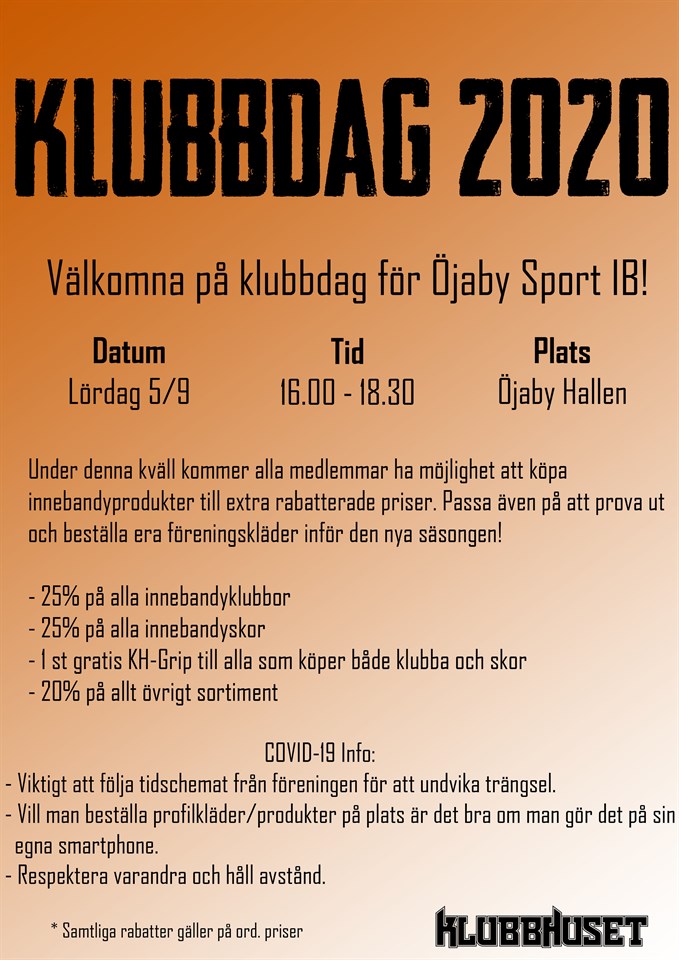 Hej! På lördagen den 5 september kommer Klubbhuset till Öjaby sporthall mellan 16.00 - 18.30 För att minimera att det blir större folksamlingar är ni välkomna på följande tider: F/P13 - F11/12 16:00 - 16:30 P12 - P11 16:30 - 17:00 P09 - P10 17:00 - 17:30 P08 - P07/06 17:30 - 18:00 Junior/A-lag 18:00 - 18:30 Detta är även ett bra tillfälle för er ledare att gå igenom era matchställ/MV ställ och lämna in det som spelarna vuxit ur. Vi kan då lämna över till nästa lag och även se om det är något vi behöver komplettera med. Tag kontakt med Håkan Stenholm i hallen. Öjaby Sport Innebandyklubb 18 aug 2020 0kommentarer