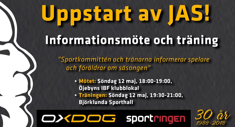 Så var det dax för informationsmöte angående Öjebyns IBF uppstart av Juniorallsvensk verksamhet 2019-2020, där tanken är att permanenta verksamheten på föreningens herrsida, i o m att vi har stora och duktiga årskullar underifrån också, och JAS är bästa tänkbara platsen att utvecklas som Juniorspelare. Inbjudna är spelare och föräldrar till samtliga lirare födda 2001-2003 som är intresserade att höra föreningens upplägg. Datum: Söndag 12 maj Tid: 18:00 Plats: Öjebyns IBF´s klubblokal Vi diskuterar upplägget kring JAS genom att prata om - Bakgrund - Träningar, samspel mellan A-lag och U-lag - Coacher/tränare - Ekonomiekonomi - Preliminära serielag och resor - Försäsongscup och träningsmatcher - Övriga frågor Sedan diskuterar vi även upplägget kring A-laget, U-laget denna kväll då alla just nu tillhör någon av dessa två trupper. Efter informationsmötet så kör vi en träning med spelarna i JAS-åldern där vi startar med ett antal övningar och sedan matchspel för att alla ska få känna sig för, efter ganska lång tids uppehåll. Träningen blir: Tid: 19:30-21:00 Plats: Björklunda Sporthall i Öjebyn Välkomna till mötet och till träningen :-D // Ledarna via Mange J
