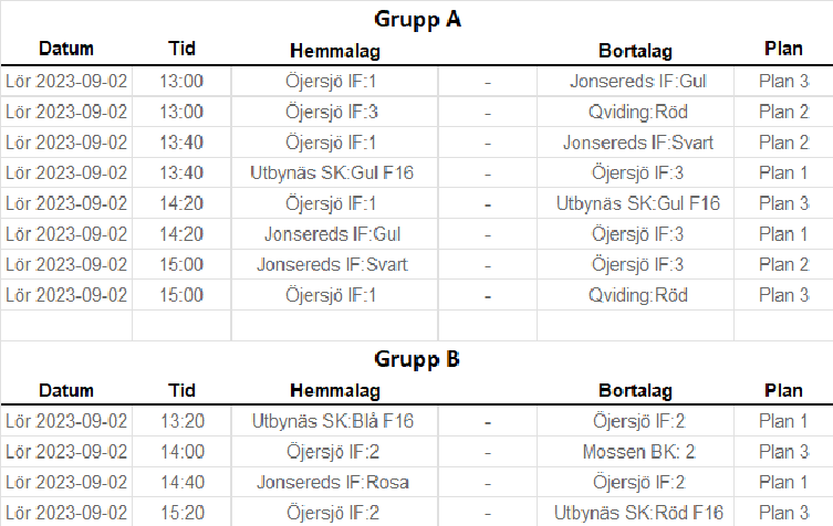 Hallå, nu har vi mer information ang. sammandraget i Jonsered 2/9. Tänk på att det oftast är mycket folk på våra sammandrag och därför kan det vara svårt med parkering. De rekommenderar därför att åka kollektivt eller samåka i den mån det går. Tjejerna spelar 3 mot 3 med sarg och alla lag spelar 4 matcher. Matchtiderna är 4x3 minuter och ligger var 20:e minut, detta gör att våra tjejer spelar var 40e minut. På den bifogade bilden finner ni spelschemat för respektive lag under dagen. Vi vill även att alla tjejer kommer till sammandraget 20 minuter innan första matchen så att vi får möjlighet att prata ihop oss och gå igenom allt med dem. Vi återkommer med uppsamlingsplats och laguppdelning snarast möjligt. //Ledarna ÖIF F17