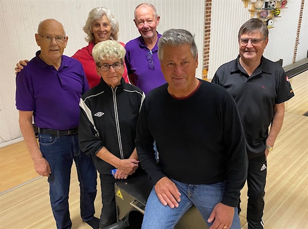 Ett samlat gäng! I mitten Rose-Marie Olausson och Torgny Ceder som var bäst för dagen. Jan Falker, Marcela Alexandersson, Håkan Gustafsson och Jan-Ingvar Ivarsson, är med då de slog ner gula käglor när de stod främst på parketten.
