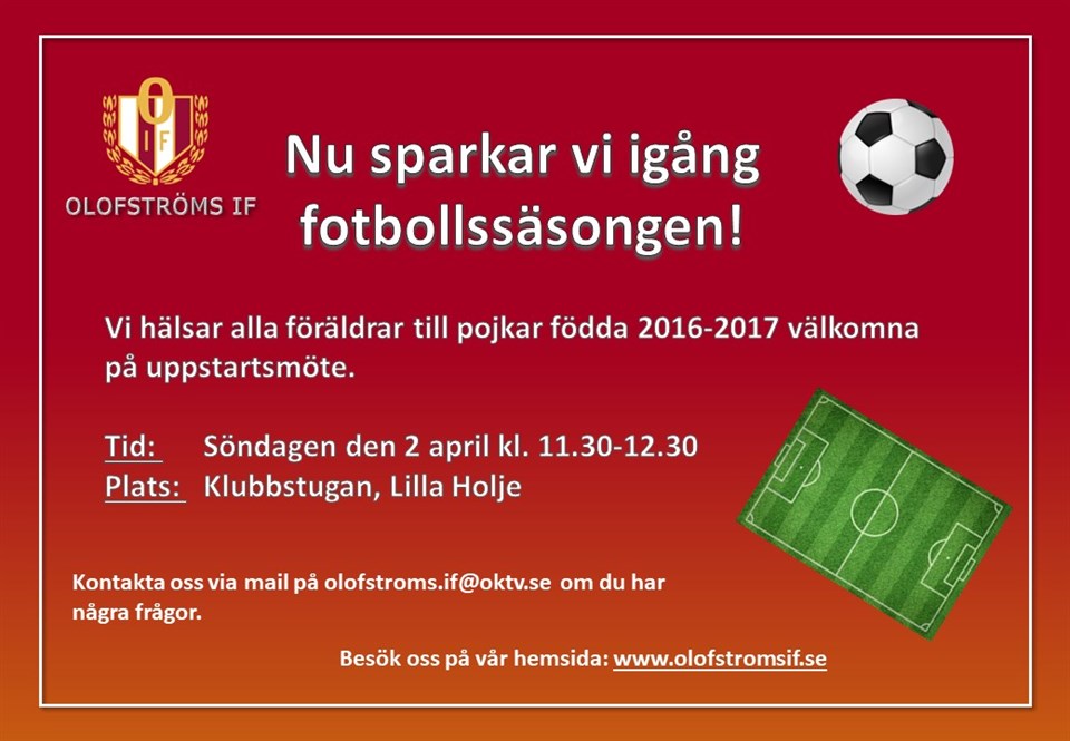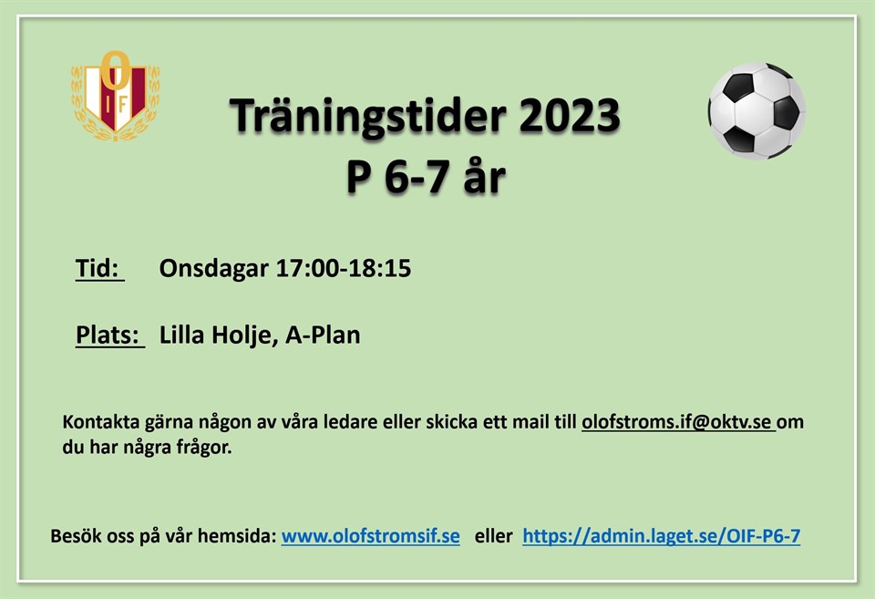 Hej! Olofströms If arrangerar fotbollsskola den 11-13 Augusti på Lilla Holje i Olofström och välkomnar alla fotbollssugna barn i åldrarna 6-12 år. Du behöver inte vara medlem i Olofströms IF eller ha spelat fotboll innan. Läs mer och anmäl dig här: Fotbollsskolan 2023 Pojkar 8-9 år (2016-2017) 8 maj 2023 0kommentarer