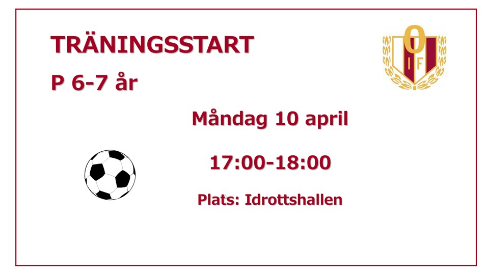 Hej! Måndagen den 10 april kör vi första träningen för laget. Då vädret fortfarande är kallt så börjar vi inomhus i Idrottshallen på måndagar kl 17:00-18:00 Detta är den tiden som gäller så länge vi är inomhus. Utomhustider är ännu inte klara så det får vi återkomma med när vi vet mer. Kom gärna i god tid så att vi hinner hälsa på varandra innan vi börjar. Glöm inte ta med gymnastikskor och benskydd. Varmt välkomna! Pojkar 8-9 år (2016-2017) 5 apr 2023 0kommentarer