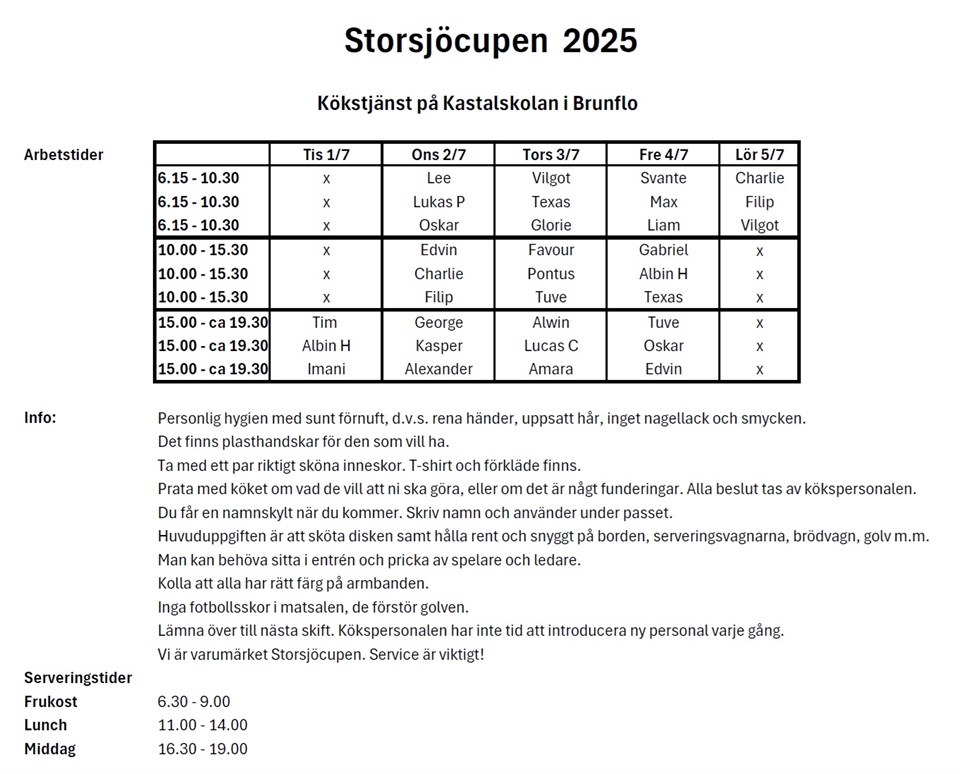 Under 2025 års Storsjöcup är vi tilldelade kökstjänst på Kastalskolan i Brunflo. Vår huvuduppgift är att hjälpa till med disk och hålla rent i matsalen på skolan. Vi har gjort en fördelning av arbete. Det är tre som jobbar samtidigt och det finns tre skift under dagen. Totalt blev det 33 arbetspass som skulle fyllas. Några har fått två skift för att alla platser ska fyllas. Passar inte tiden måste ni SJÄLVA byta med varandra. Meddela också gärna oss så uppdaterar vi listan.