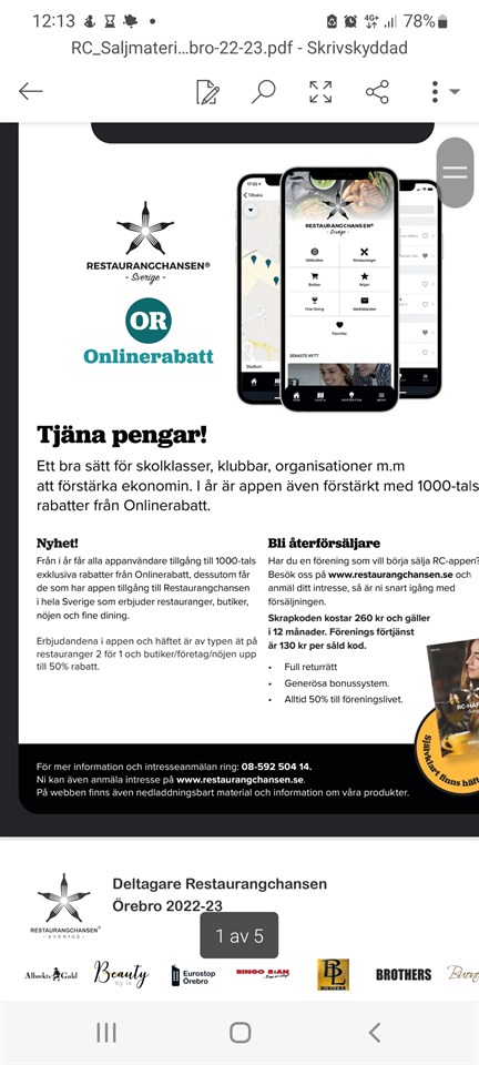 Hej! Nu är det dags att prata med nära och kära om restaurangchansen. Den finns som häfte för Örebro och en del andra städer eller app och kostar 260 kr. Nyhet för i år är appkoden gäller 365 dagar from det datum man skrapar den och att man har tillgång till alla rabatter och anslutna städer. Alltså överallt!!! Den 4 oktober får vi hämta ut häften och material. Jag vill veta månd. 27/9 hur många ni vill ha uppdelat på häfte (om det är för en annan stad än Örebro) /app. Vi tjänar 130 kr per sålt häfte/app. Mvh Åsa
