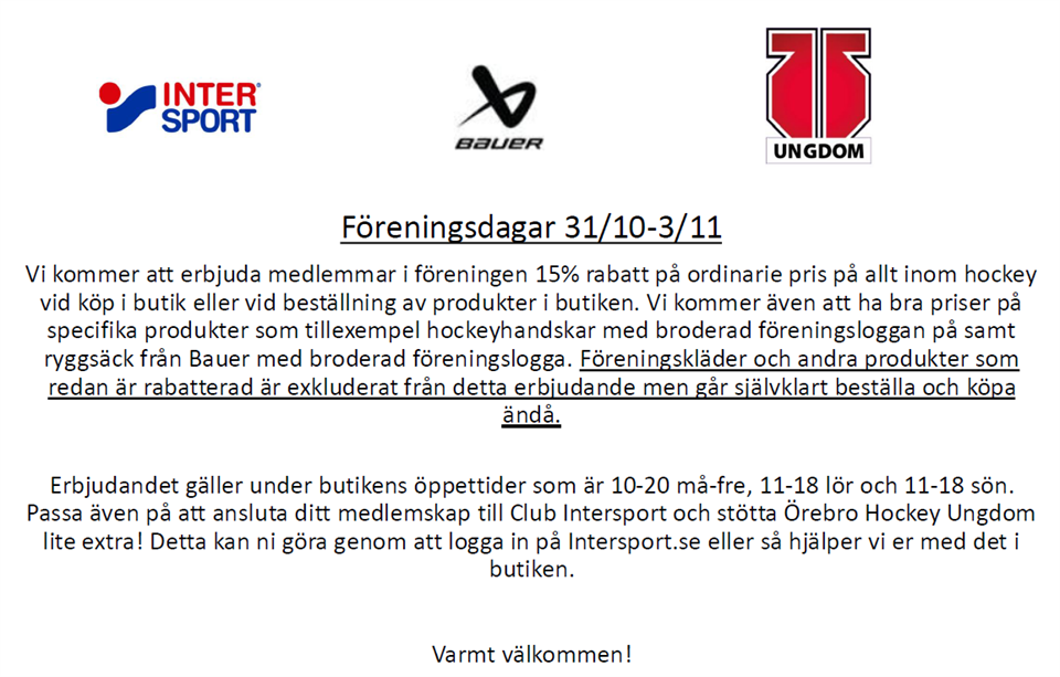 Föreningsdagar 31/10-3/11 Vi kommer att erbjuda medlemmar i föreningen 15% rabatt på ordinarie pris på allt inom hockey vid köp i butik eller vid beställning av produkter i butiken Intersport Marieberg. Vi kommer även att ha bra priser på specifika produkter som tillexempel hockeyhandskar med broderad föreningsloggan på samt ryggsäck från Bauer med broderad föreningslogga. Föreningskläder och andra produkter som redan är rabatterad är exkluderat från detta erbjudande men går självklart beställa och köpa ändå. Erbjudandet gäller under butikens öppettider som är 10-20 må-fre, 11-18 löroch 11-18 sön. Passa även på att ansluta ditt medlemskap till Club Intersport och stötta Örebro Hockey Ungdom lite extra! Detta kan ni göra genom att logga in på Intersport.se eller så hjälper vi er med det i butiken. Varmt välkommen!