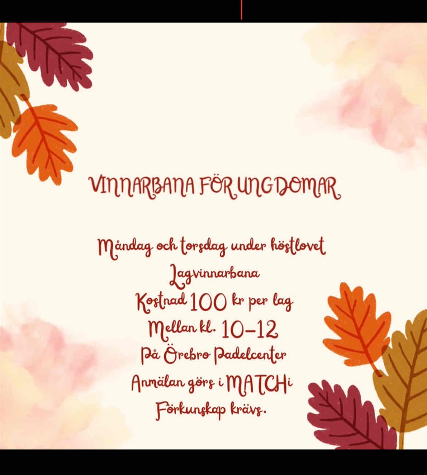 På höstlovet anordnar vi lag-vinnarbana för ungdomar. Måndag och torsdag kl. 10-12 anmälan görs på MATCHi.