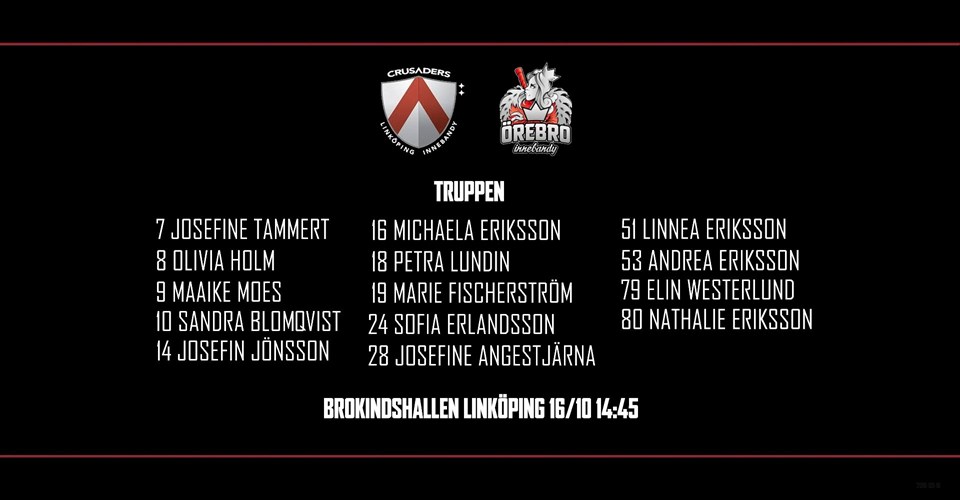 Idag väntar generalrepetition mot Allsvenska Linköping IBK borta i just Linköping och Brokindshallen. Laget har konstant under försäongen matchats mot tufftmotstånd från Allsvenskan eller toppen av division 1, nu väntar ännu ett Allsvenskt motstånd. Vi har lite frånvaro i truppen, men med en mycket bra träningsvecka bakom oss rullar bussen (Lets Go By Bus) iväg mot Linköping! Nästa helg väntar seriepremiären i Division 1 borta mot Lillån IBK (23/9 13:00 Idrottshuset). Vi vill även passa på att redan nu tipsa om Division 2 premiären som sker i Mellringehallen den 25/9 19:00. DAGENS TRUPP 7 JOSEFINE TAMMERT 8 OLIVIA HOLM 9 MAAIKE MOES 10 SANDRA BLOMQVIST 14 JOSEFIN JÖNSSON 16 MICHAELA ERIKSSON 18 PETRA LUNDIN 19 MARIE FISCHERSTRÖM 24 SOFIA ERLANDSSON 28 JOSEFINE ANGESTJÄRNA 51 LINNEA ERIKSSON 53 ANDREA ERIKSSON 79 ELIN WESTERLUND 80 NATHALIE ERIKSSON Onsdag den 19/9 19:00 är det SSL premiär för vårt herrlag i Idrottshuset! Ni missar väl inte det? Vi gör inte det!