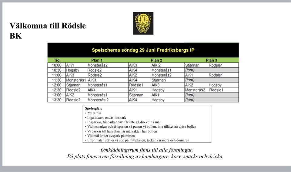 Alla killar samlas kl 09.30 vid Rödsle BKs klubbstuga.