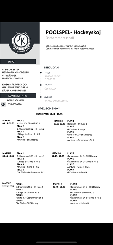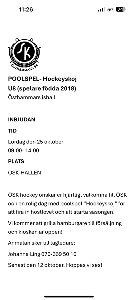 Klicka på bekräftelselänken i det mejl vi skickat dig för att börja ta emot uppdateringar från Östhammars SK Ishockey Team U9.