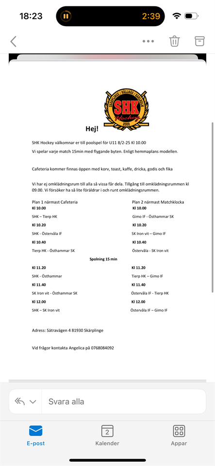 Hej. Nu är det dags för vårt hemma poolspel på lördag den 1 feb. Första matchen börjar kl 8,35 Matchschema kommer. Vi behöver så klart hjälp av er föräldrar för att kunna genomföra poolspelet. Här är arbetsuppgifterna inför dagen Kiosk - Julia Löwen och Linnea Andersson Ställa ut bänkar/ Bygga sarg - Carl Elmer och Andreas Söderblom Speaker - Per Malmsten och Tobias Westerlund Städa omklädningsrum - Malin Holmgren 2 domare - Isak och Ivar Kontakta mig om frågor 0738154579 Ishockey Team 14 26 jan 2025 0kommentarer