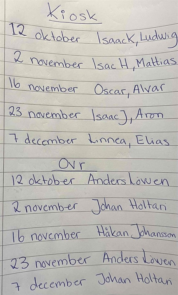 Här kommer schema för höstens matcher på Ovr och kiosk. Kan du inte ditt tillgängliga datum är det upp till dej att byta med någon annan. Med vänlig hälsning, Team 13 1 okt 2024 0kommentarer