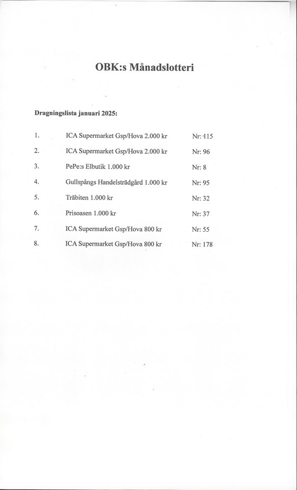 Dragningslista månadslotteriet Januari 2025. Stort Grattis till Vinnarna!