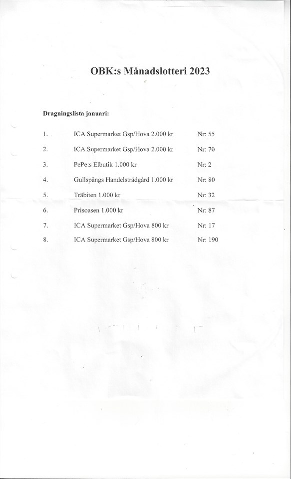 Dragningslista månadslotteriet Januari Grattis till alla vinnare! Otterbäcken-Hajstorp 2 feb 2023 0kommentarer