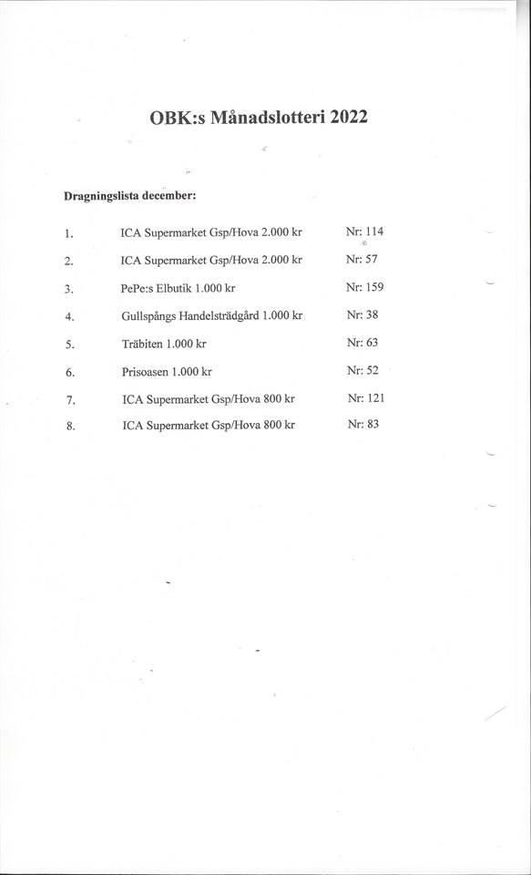 Här kommer dragningslista på månadslotteriet december månad. Grattis vinnare! Otterbäcken-Hajstorp 1 jan 2023 0kommentarer
