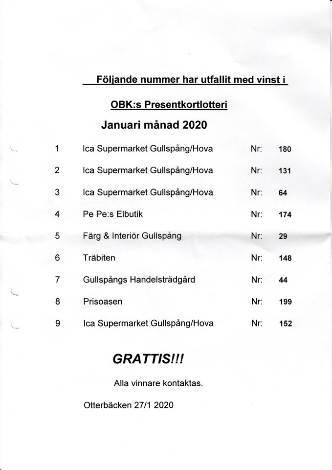 Dragningslista Månadslotteriet Januari-20!