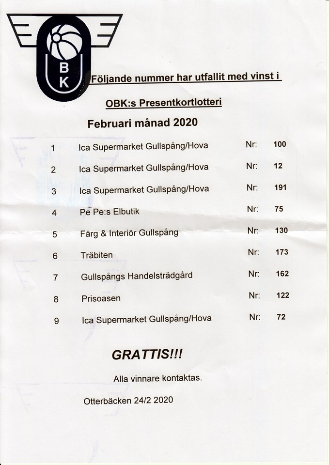 Dragningslista Månadslotteriet Februari-20!