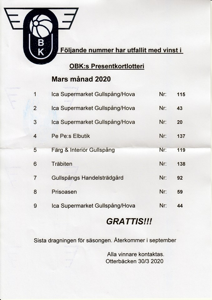 Här kommer säsongens sista dragningslista som avser mars månad. Grattis till vinnarna och ett stort tack till alla som köpt lotter denna säsong. Vinnarna kommer att meddelas!