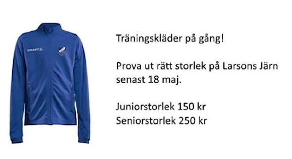 Larsons Järn har hängt upp jackor och byxor i alla storlekar en trappa upp i butiken. Gå förbi där och prova ut rätt storlek. Hos Larsons finns också en lista där ni skriver namn, lag, om ni vill beställa både jacka och byxor, samt vilken storlek. Gör detta senast 18 maj!