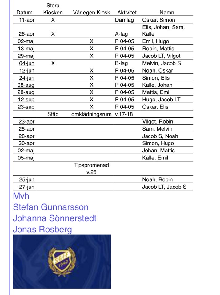 Hej på er, Som tidigare år har lagen fått i uppgift att bemanna kiosken på några av seniormatcherna A, B samt damlag. Vi ska också städa omklädningsrummen vissa dagar och bemanna tipspromenaden i Ugglarp tisdag & torsdag v.26. I kiosken finns det en lathund/beskrivning på punkter att göra, kassan kommer finnas på plats. Vi kommer även att ha en egen kiosk som tidigare på grabbarnas hemmamatcher som ska bemannas och här är det helt ok att baka själv om man vill😊 Vi har fördelat tillfällena så gott vi kunnat och kan ni inte så byt med varandra, så vi får ihop helheten. P-04/05 13 maj 2019 0kommentarer