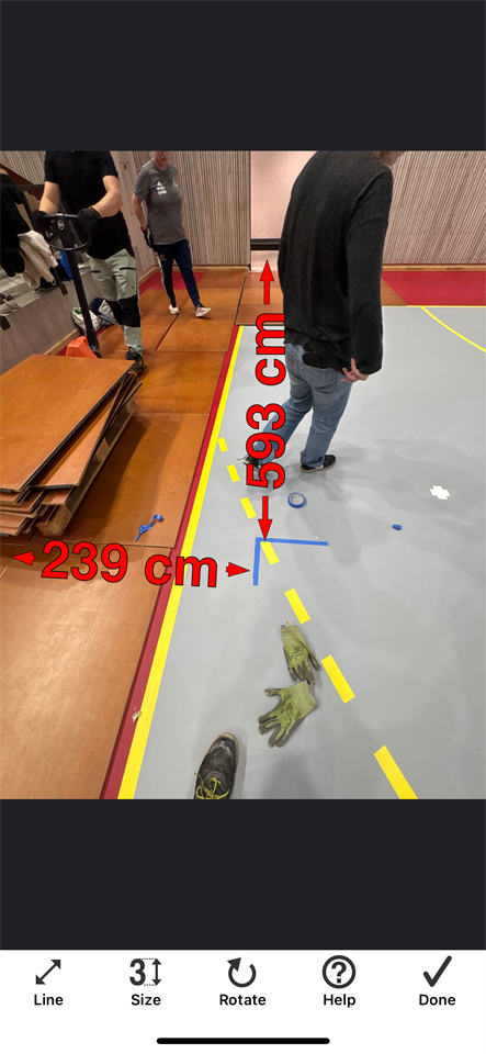 Vi har nu gjort en tejpmarkering i golvet som vi hoppas ska få vara kvar någon vecka. Vi har även tagit mått som vi kommer att lägga ut här på laget om nu markeringen försvinner(mätt från golvsockeln).