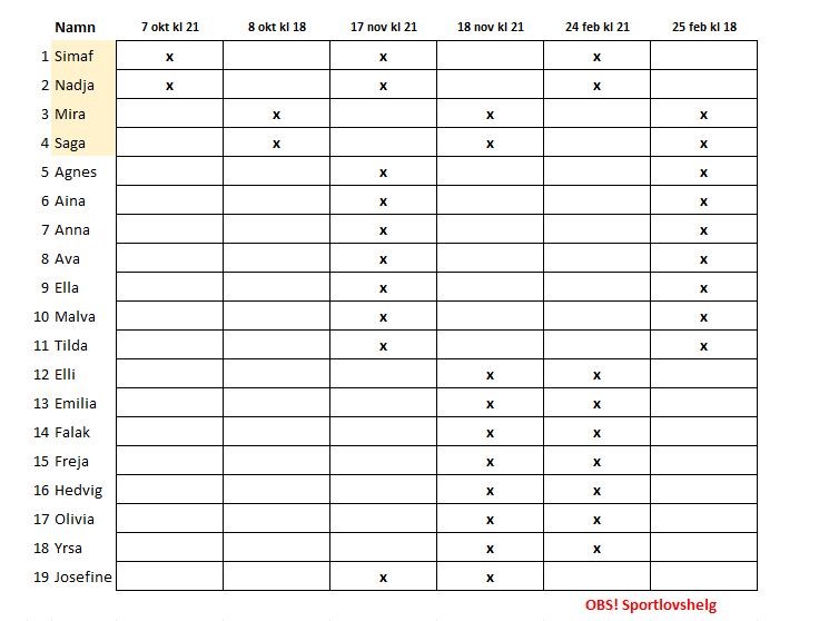 Här kommer shcemat för basketgolvbygget 2022/2023! Observera att i februari är det sportlov när vi bygger/river så byt gärna pass redan nu om ni ska resa bort. Vi behöver alla hjälpas åt. Optimalt är att vara 10-12 st. Barnen kan vara med och sätta ihop plattorna medans vi vuxna bär plattorna. Tar ca 2-3 timmar att bygga och lite snabbare att riva. Skriv i kommentarrerna här ifall ni byter/vill byta. Mvh Lisa F-10 2 okt 2022 7kommentarer