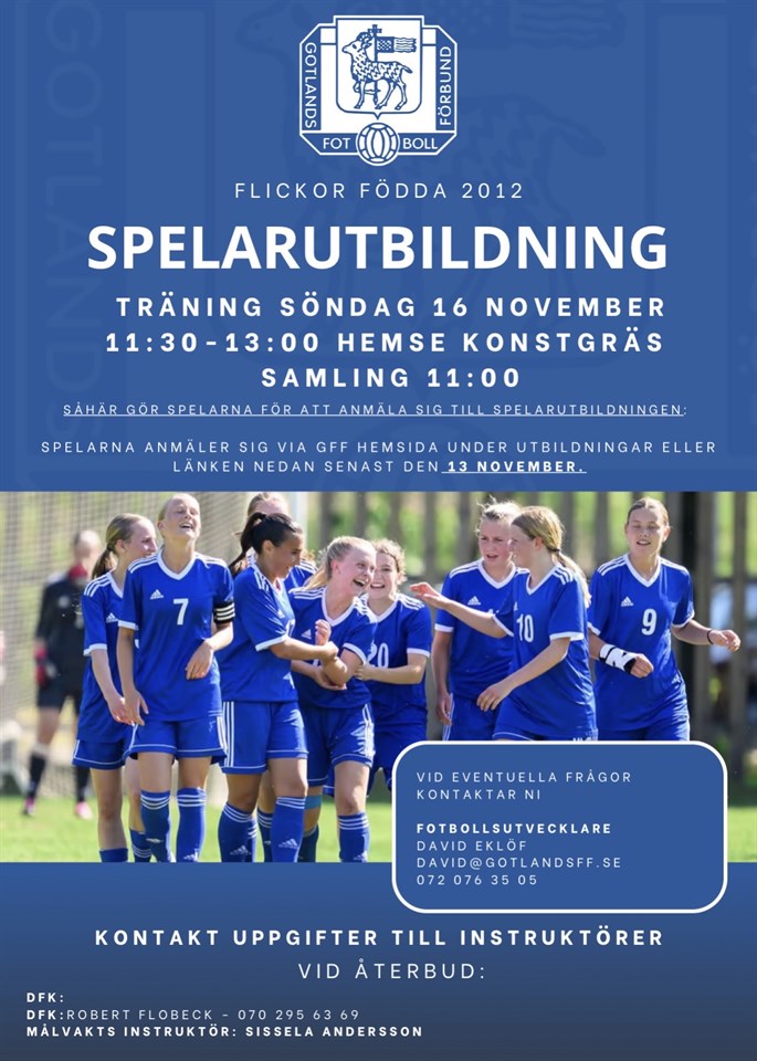 Gotlandsfotbollsförbund bjuder in till spelarutbildningstillfälle för flickor födda 2012 den 16/11.