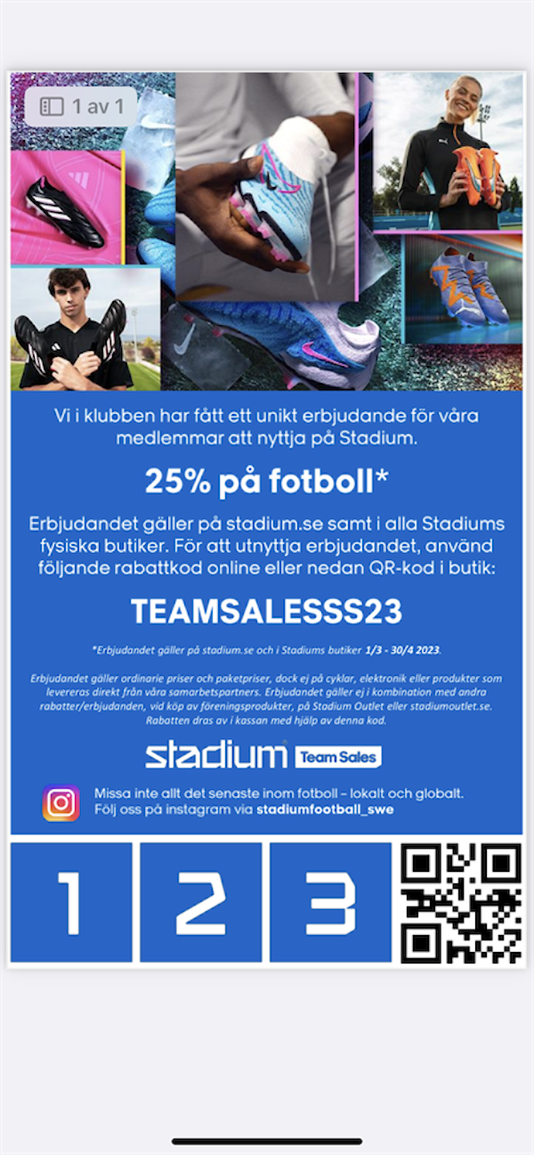 Klubben har fått ett erbjudande på Stadium, där vi kan köpa allt som har med fotboll att göra till 25% rabatt.