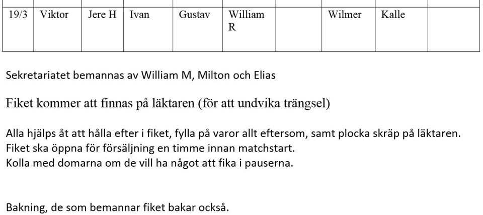 Sekretariatet bemannas av William M, Milton och Elias Fiket kommer att finnas på läktaren (för att undvika trängsel) Fiket ska öppna för försäljning en timme innan matchstart. Kolla med domarna om de vill ha något att fika i pauserna. Bakning, de som bemannar fiket bakar. OBS! De som har försäljning av matchprogram har hand om insläppet. De om har försäljning av puckar till puckkastartävlingen hjälper till i insläppet. Dessa måste vara på plats i god tid före matchen. Det fattas fortfarande sjukvårdsansvarig. Någon som känner sig manad att ta den rollen så hör av er så lägger jag in er där. A-lag 10 jan 2022 0kommentarer
