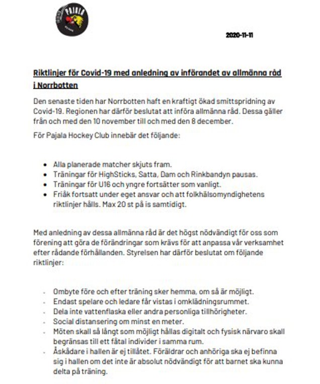 Riktlinjer med anl av införandet av allmänna restriktioner A-lag 13 nov 2020 0kommentarer