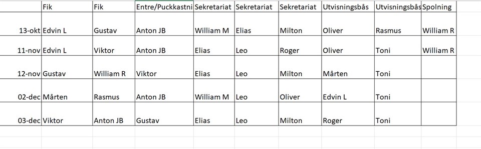 Här kommer arbetsschemat för hösten 2023. Kan man inte jobba sitt pass så ansvarar man för att byta med annan i laget. Fredag 13/10 lagar vi mat till Kalix, kan de som har fiket laga och servera mat, maten serveras efter matchen. Vill någon fler hjäpa till så är det välkommet. Den som bemannar fiket bakar till sitt pass. A-lag 10 okt 2023 0kommentarer