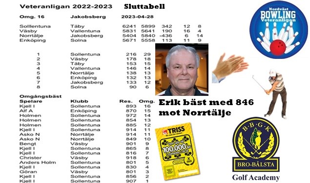 Säsongens sista match slutade med en klar vinst mot Norrtälje med 14-6 efter att haft ledningen hela vägen. Slagningen blev också bra med 5840. Det var vi nöjda med. Erik hade toppat formen till sista matchen och strikade ihop hela 846. Högsta slagningen i Käglan denna säsong. Hatten av. Beröm även till Peter med 817 och Helena med 786. Som par vann alla sina matcher. Över 700 var även Jalle med 741 och Ove med 704. En mindre bra säsong av Käglan som belade tredje sista plats i ligan. Vi har spelat mycket ojämnt denna säsong med både dalar och några fåtal toppar. Finns mycket att bättra på till nästa säsong. Bl.a tidigt spel på nyoljat var en sak. En annan är för lite träning. Men det kan vara ett problem för många av olika orsaker. Av någon anledning spelar några bättre borta än hemma. Att vår hemmahall har det jobbigt med maskineriet är tyvärr ingen nyhet för alla som spelar eller spelat i hallen. Åter igen var det problem under dagen för Veteranligan. Irriterande för deltagande lag med förseningar som följd. Inga glada miner där inte. Hur blir det till hösten ? En befogad fråga till styrelsen att ta upp med hallägaren snarast. Blir inte förvånad om att det blir färre på onsdagar till hösten. Krönikör kanske för sista ggn webmaster.