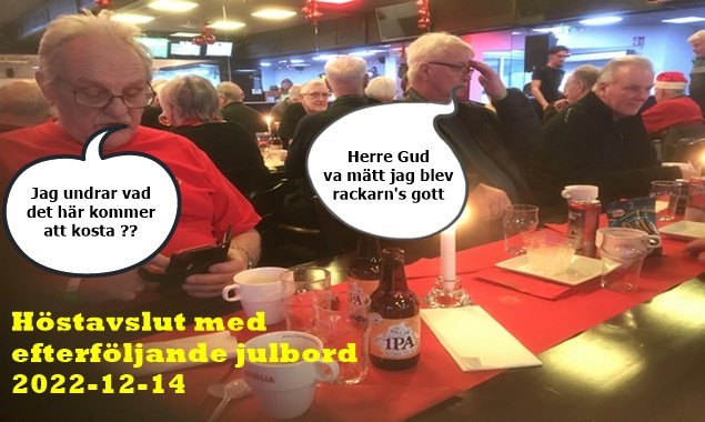 Höstens spel avslutades idag 14 dec med som vanligt stor uppslutning av medlemmar som ville vara delaktiga i dagens aktiviteter. Bra uppslutning dagen till ära med hela 32 medlemmar. Dagen inleddes med en striketävling som grund till bowlingbingon med fina priser. Efterföljande möte började med Bingo efter striketävlingen. Mötet fortsatte med presentation, prisutdelning och redovisning av höstens aktiviteter och planer för våren. Efter mötet gick promenaden till ett dignande och hägrande julbord.Som vanligt var det hög kvalite på allt som gick att äta. Stort tack till Emil med personal. Protokoll från mötet, kalender och lagen för våren kommer mycket snart att finnas tillgängliga både i hallen och på hemsidan. Mätta och belåtna önskade alla varandra en God jul och ett Gott nytt bowlingår. Noterat av webmaster som med många gick hem proppmätta som vanligt