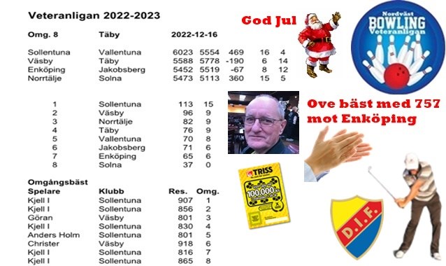 Skönt att vi kunde ta revanch på Enköping efter förra förlusten. Nu tog vi i redan från start med en klar 4-1 ledning som vi sedan aldrig släppte. Matchen var avgjord redan efter 3 serier med en 11-4 ledning. Enköping vann sista med 4-1. Slutsiffrorna skrevs till klara 12-8 i vår favör. Och därmed passerade vi Enköping i tabellen. Totalen blev godkända 5519. Bäst för dagen var Ove med 757 tätt följd av Erik med 755 och Jalle 744. Övriga i laget kämpade tappert men nådde inga större höjder. Nu blir det spel uppehåll fram till 13 jan 2023 då vi möter Sollentuna i Väsby kl.12.30. Noterat av webmaster via datorn denna kyliga dag (-15 grader). Men segern värmde.