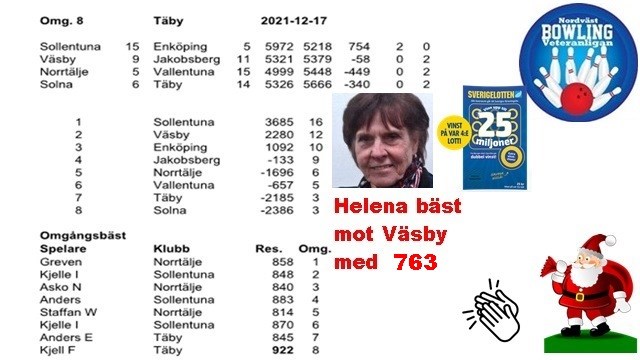 Trots några gubbar borta mot topplaget Väsby hade detta ingen betydelse. Laget vann ändå och tog en snygg skrällseger. Utan respekt tog Käglan ledningen med 4-1 i första serien. Väsby började ana oråd och kom igen med seger i följande serier och ledde med 8-7 inför sista serien. Men Käglan gav sig inte utan klämde till med högsta serien i sista. Och med 4-1 i sista slutade matchen 11-9 i vår favör. Bra jobbat. Bäst jobbade paret Lasse och Helena som vann alla sina serier. Kul att Helena lyckades och var bäst med 763 före Lasse med 736. Övriga var under 700. Nu väntar ett långt uppehåll till 14 jan.då vi möter Sollentuna i Väsby. Krönikör på distans Webmaster. God Jul till alla.