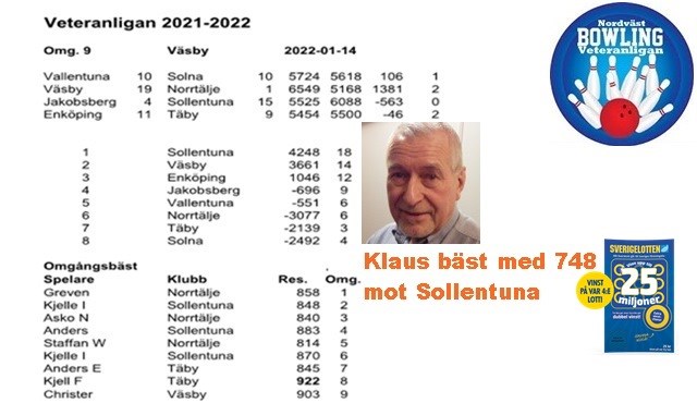 Inga poäng i omstarten av ligan.Största förlusten denna säsong. Men så mötte vi också Sollentuna som leder serien. Kanske vi kunde ha gjort det bättre men käglorna ville inte trilla omkull. Dock ingen katastrof. Vi var aldrig med i matchen denna gång. Slagningen blev låga 5525 som kunde ha varit bättre. Bäst för dagen blev Klaus med godkända 748. Över 700 var också Janne, Åke och Erik. Övriga hade en sämre dag tyvärr. Vi får ta nya tag i nästa match mot Täby 28 jan. i Norrtälje. Spelande krönikör denna dag webmaster som också var tvungen att dela ut ett gult kort till Lasse Linder i Sollentuna för en incident.