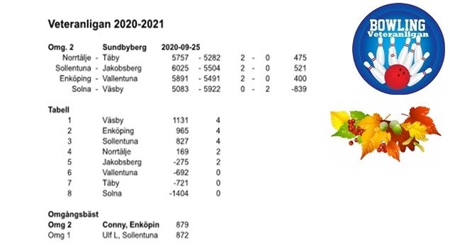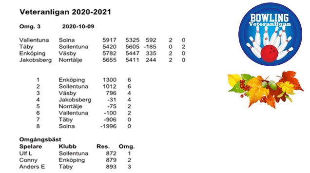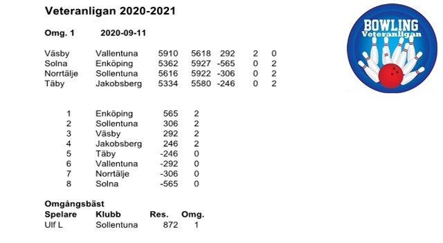 Dagens premiär i veteranligan spelades på ett mycket annorlunda sätt. Nu spelades det endast om poängen för den totala slagningen i varje match. Men mycket är ju annorlunda i dessa tider. Huvudsaken var att lagen kan spela under hösten. Vi får hoppas det kan bli en ändring till våren. Vi får ta denna nödlösning så länge. Alla matcher spelades med ganska bra resultat trots allt. Enköping hade bästa slagningen denna första omgång med 5927. Vår match mot Täby slutade med komfortabel seger med plus 246 poäng. Slagningen blev godkända 5580. Godkänt också med 6 man över 700. Bäst blev Jalle med 749 före Janne 739, Erik 723, Reino 718, Åke 711 och Helena 706. Nästa match är mot starka Sollentuna om 2 veckor. Spelande krönikör webmaster. PBK Käglan Järfälla 11 sep 2020 0kommentarer