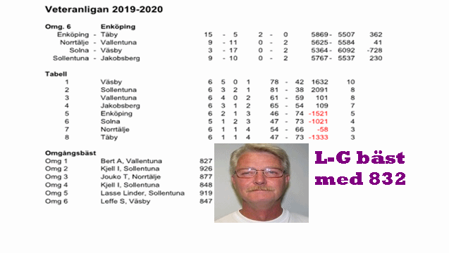 Åter igen en rysligt spännande och tät match som publiken gillade. Denna gång mot serieledarna Sollentuna som Käglan kämpade ned med tålamod och kämpatakter. Trots underläge i många matcher och serier vände vi med minsta möjliga marginal och tog viktiga poäng. Vi chockstartade med en 4-1 ledning i första. Men Sollentuna kontrade med 5-0 och vi låg under med 6-4 efter halva matchen. Vi svarade utan pardon med 4-1 och ledning med knappa 8-7 efter 3 serier. Sista serien skulle bli en riktig nagelbitare. Efter halva serien låg vi under i 3 matcher av fyra och en förlust låg på lut. Men vi gav inte upp utan spurtade starkt samtidigt som Sollentuna började missa och visa nerver. L-G/Peter och Lasse/Janne vände sina matcher samtidigt som Jalle/Erik lyckades få oavgjort i sin match och därmed rädadde segern till Käglan med knappa 10-9. Bra jobbat alla. Trots att Sollentuna hade drygt 200 bättrre i slagning tog vi dom viktiga poängen. Bäst för dagen var L-G med 832 (topp 3 för dagen). Sedan följde Lasse med 740 och Erik 732. Övriga under 700 men kämpade hårt. Vi intar just nu en stabil 4:e plats i tabellen med möjlighet att avancera när vi möter Solna i Norrtälje 29 nov. Resan hem gick lätt denna dag trots kvällsmörkret. Strålande krönikör denna dag webmaster