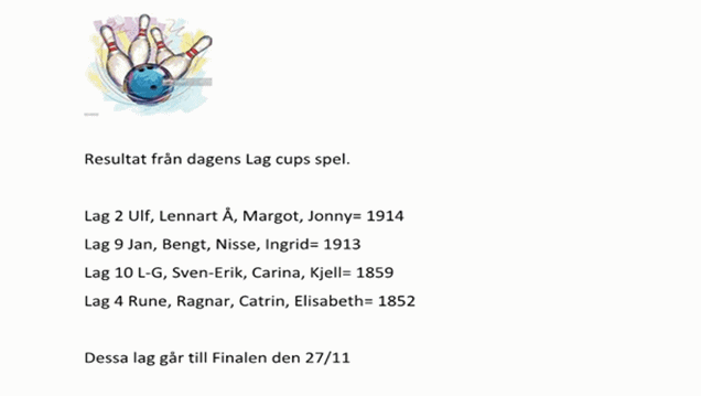 Kvalspelet till Lag Cupen finalen den 27/11 spelades på onsdagen med bra resultat för dom 4 bästa som gick dit. Som var följande. Lag 2 med Ulf, Lennart Å, Margot och Jonny toppade med 1914 före Lag 9 med Jan, Bengt, Nisse och Ingrid (90 år !) med 1913. Sedan följde Lag 10 med L-G, Svenne, Carina och Kjelle med 1859 till final gick också Lag 4 med Rune, Ragnar, Catrin och Elisabeth med 1852p Lycka till i finalen alla lagen.