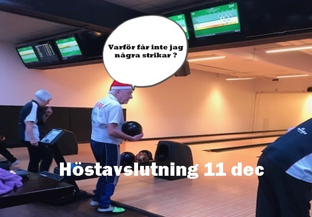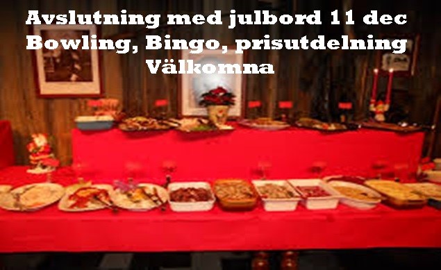 Höstens spel avslutades idag 11 dec med som vanligt stor uppslutning av medlemmar som ville vara delaktiga i dagens aktiviteter. Dagen inleddes med en striketävling som grund till bowlingbingon med fina priser. Efterföljande möte började med att välkomna två nya medlemmar nämligen Reino Saari och Ove Ledin. Efter ett kort möte med presentation, prisutdelning och redovisning av höstens aktiviteter och planer för våren, gick promenaden till ett dignande och hägrande julbord.Som vanligt var det hög kvalite på allt som gick att äta. Stort tack till Emil med personal. Protokoll från mötet, kalender och lagen för våren kommer mycket snart att finnas tillgängliga både i hallen och på hemsidan. Mätta och belåtna önskade alla varandra en God jul och ett Gott nytt bowlingår. Noterat av webmaster som med många gick hem proppmätta som vanligt.