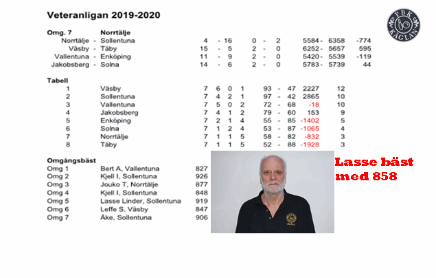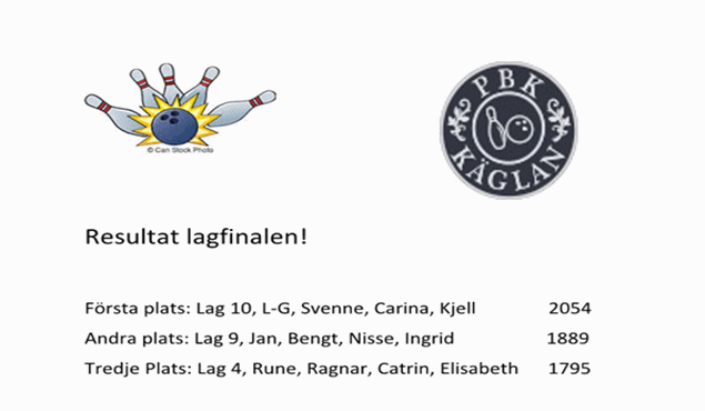 Black friday förvandlade Käglan till en en white and light friday istället eftersom snön täckte marken och laget avslutade i Norrtälje med en komfortabel vinst över svårspelade Solna med fina 14-6. Matchen startade dock i ett knappt underläge med 2-3 efter första serien. Käglan vaknade sedan till och med 4-1, 4-1 och 4-1 var det inget snack om saken. Slagningen blev fina 5783 efter mycket bra spel på många håll. En som har hittat formen är Lasse som strikade ihop hela 858 och årsbästa. Tätt bakom och ännu en gång över 800 var L-G med 818. Sedan följde vår nya medlem Ove Ledin med finfina 775, mycket bra debut. Över 700 var också Erik med 758 och Peter med 736. Vi landade på en 4:e plats i ligan knappt bakom Vallentuna och Sollentuna. Väsby tog första platsen. 13 dec före lunch spelas en extra omgång i Vallentuna där Väsby möter Vallentuna och Sollentuna möter Käglan bland dom 4 bästa. Övriga lag spelar senare samma dag. Krönikör på distans och online var webmaster.