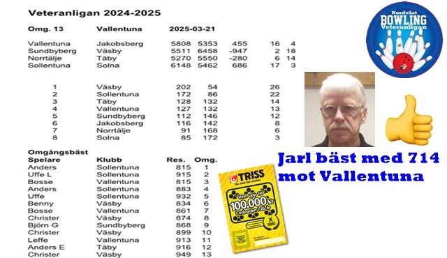 Sista matchen i V-ligan gick i hemmahall mot Solna denna tidiga morgon. Vi hade revanch att fodra från hösten. Vilket vi också gjorde med akuratess. Skönt att sluta hemma med en seger. Vi gick ut hårt och ledde med 8-1 efter halva matchen. Avslutade till slut resultatet 13-6. Totalen 5688 känns som klart godkänt. Med 5 man över 700. Bäst blev Åke med 781, följd av Ove 774, Jalle 757, Lasse E 719 och Peter 705. Vi hamnade till sist som lag 6 av 8 i tabellen med 10 poäng. Vilket kanske kunnat varit bättre enligt vår målsättning. Vi får ta nya tag till hösten och sikta på en plats på övre halvan. Tack alla som bidragit till spel i Veteran-ligalaget denna säsong. Krönikör Webmaster. PBK Käglan Järfälla 7 apr 2kommentarer