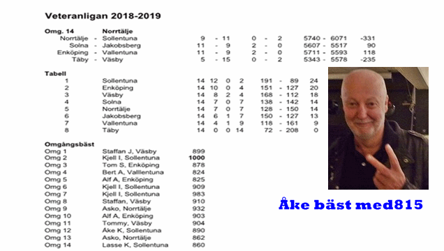 Säsongens ligasäsong 2018-2019 startade i dur men tyvärr slutade i moll. Nåja inte så allvarligt som det låter. Vi kunde ha slutat säsongen på ett snyggare sätt, men vi missade att knyta ihop säcken i sista serien för säsongen mot Solna i Norrtälje. Trots en mycket dålig start vände vi matchen till vår fördel till 8-7 inför sista serien. Men Solna vann på sin jämnhet i sista serien.Och vände matchen till vinst med knappa 11-9. Surt sa räven. Vi hade inte marginalerna på vår sida i slutet tyvärr. Den profil som spelades var inte till vår fördel kan man säga. Vi var inte vana vid denna profil. Den som lyckades bäst för dagen hos oss var Åke som toppade med fina 815. Övriga godkända var Klaus med 729 , Peter 714, och Jarl 710. Övriga slet sitt hår i vilt förtvivlan över profil och och käglorna. Hoppas att vi kan ladda om till en ny säsong till hösten. Mer om detta och om framtiden i Jakanhallen blir vi säker varse inom en snar framtid. Vi har ju en drygt månad kvar innan avslutet i maj. Krönikör denna dag i Roslagens famn var webmaster.