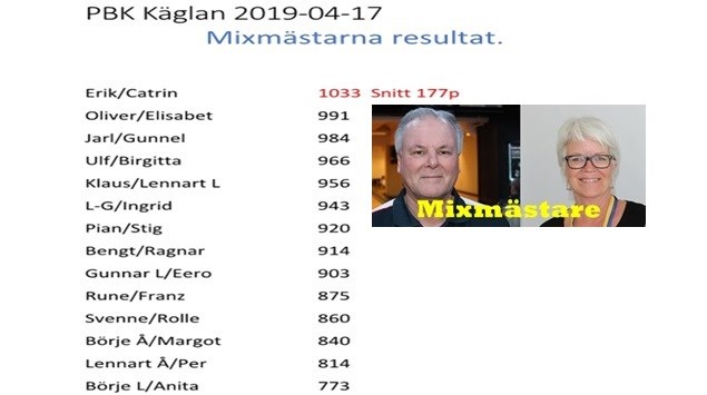 Mixmästerskapet avgjordes på onsdagen i strålande väder. Trots det fina vädret hade 14 par intagit banorna med förhoppning att spela hem titeln Mixmästare 2019. Spelet böljade fram och tillbaka över 6 serier där damerna slog första slaget i varje ruta. Dom som behärskade denna spelform bäst eller kanske hade mesta turen med kägelfallet var mycket överraskande paret Erik/Catrin som satte övriga förhandstippade på plats. Dom vann en klar seger före paret Oliver/Elisabeth och på tredje plats kom paret Jarl/Gunnel. Övriga som inte nådde upp på prispallen får gå hem och trösta sig med lite påskgodis. GLAD PÅSK alla tuppar och hönor.